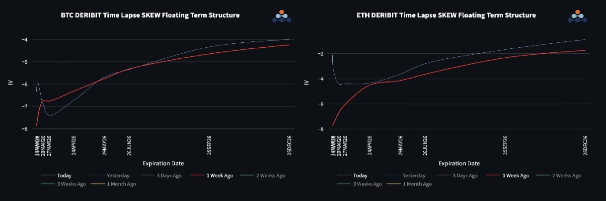Bitcoin skew has shown only modest changes, with front-week demand for puts declining while one-month downside protection increased slightly. Ethereum experienced a more notable shift, with put skew across the curve falling significantly.