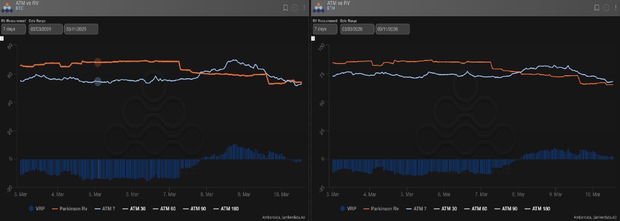 Realized volatility has cooled following recent market turbulence, settling near the mid-50s for Bitcoin and around 70 for Ethereum.