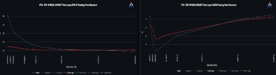 BTC front-end implied vols drifted slightly lower, while ETH exploded 20 vols higher due to the sharp move.