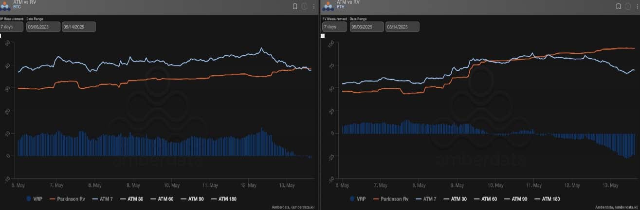 Bitcoin’s realized volatility climbed about 8 points as it broke back above 100k. Ethereum stole the show—realized vol surged to 90% as it jumped 30% in just two days.