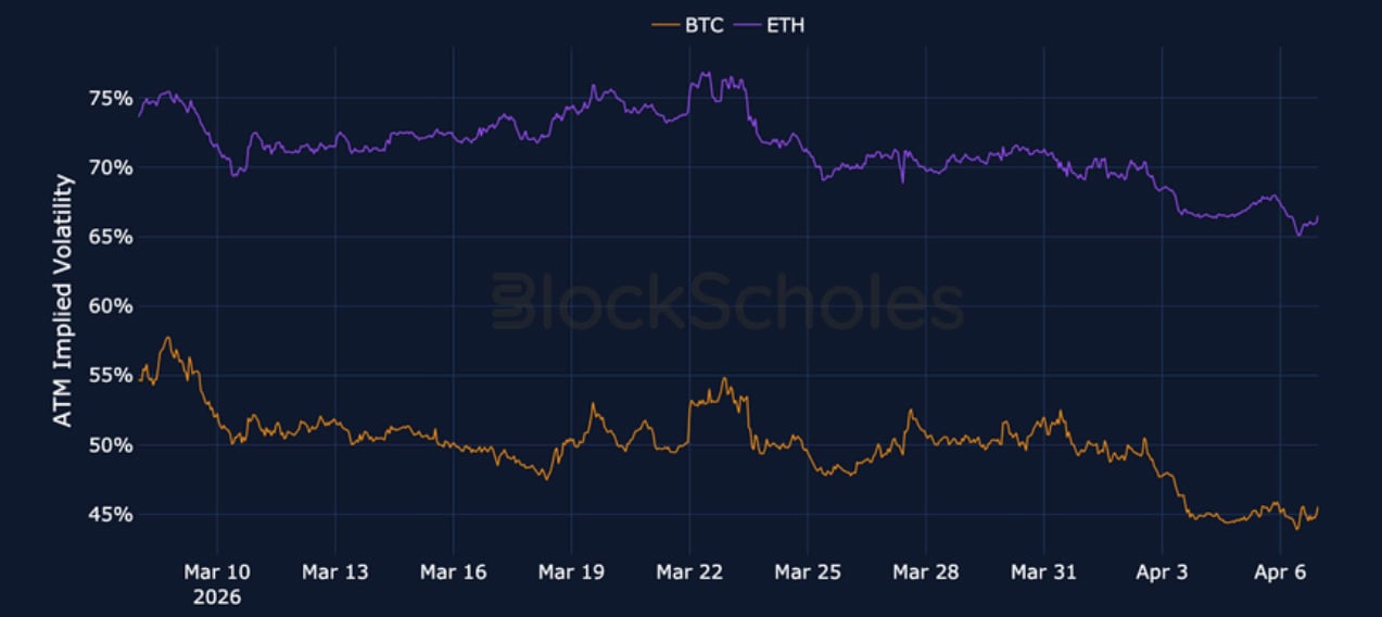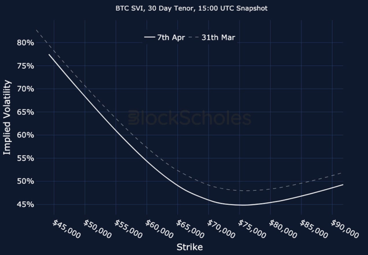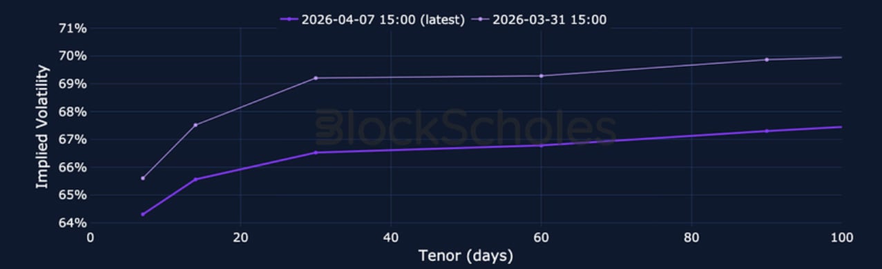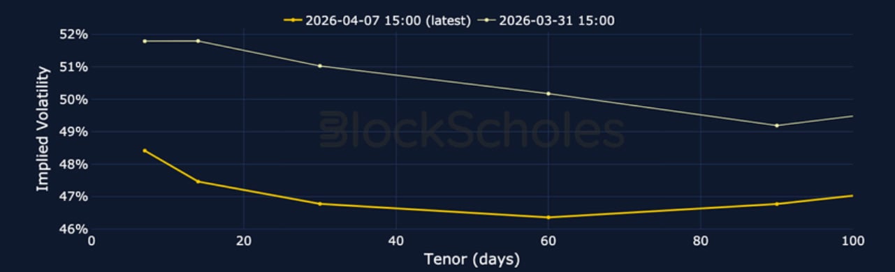 Volatility levels remain elevated but less sharply inverted across BTC and ETH options markets compared to one week ago. The halt in the selloff in spot prices that sees BTC now trade ~45% below its October 2025 all-time high has seen a recovery in risk sentiment, as indicated by Block Scholes’ risk appetite index. ETH’s risk appetite index value is higher, and closer to crossing the -0.5 level that has historically preceded bullish momentum. However, directional sentiment remains strongly pessimistic across crypto option markets as the skew towards OTM puts remains strong. While BTC’s skew is not quite as strong as last week, continued uncertainty generated by the war in Iran continues to influence risk-on assets across markets as Trump has given Tehran until Tuesday, 8:00 P.M. Eastern Time to reach what he describes as an “acceptable” agreement.