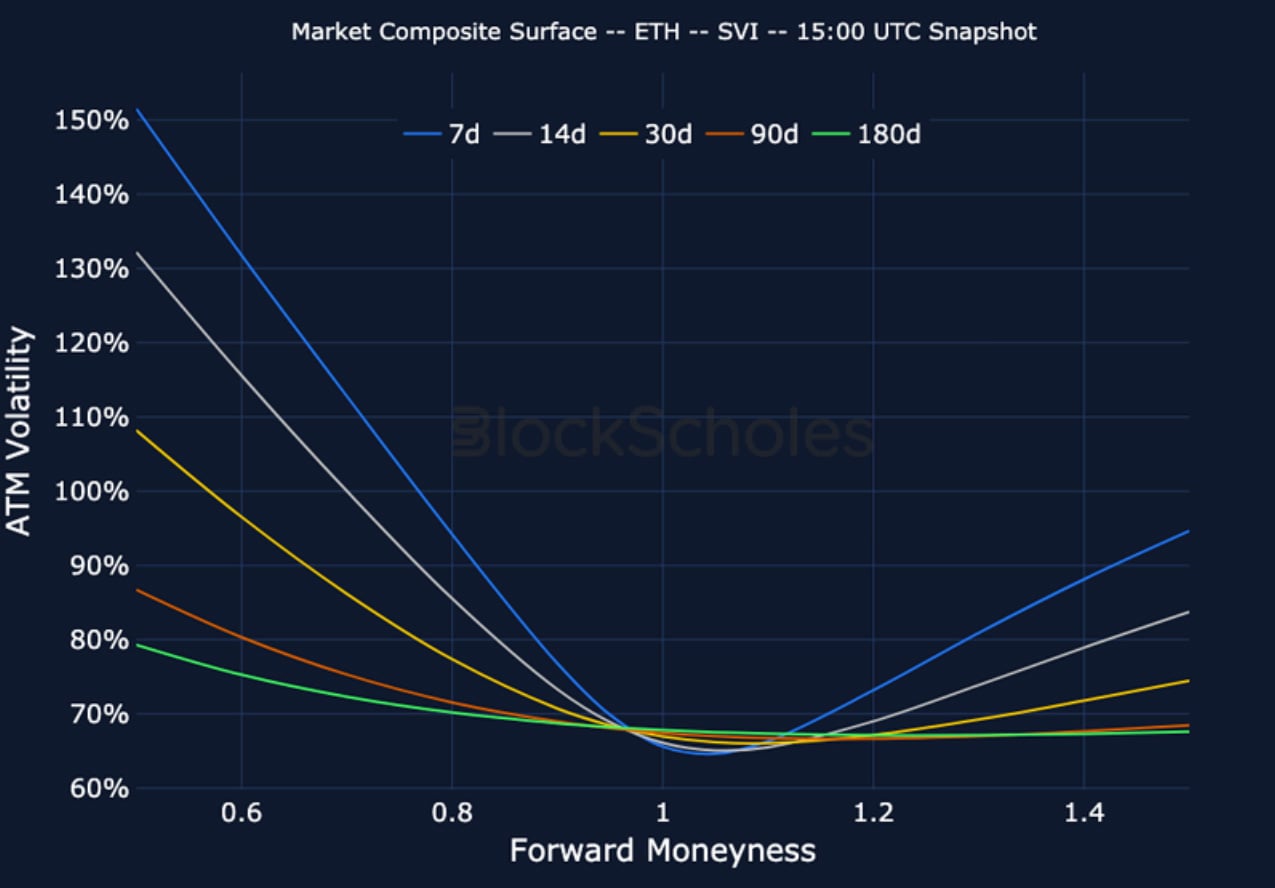 ETH SVI ATM IMPLIED VOLATILITY – While volatility levels remain elevated, the term structure has disinverted with shorter tenors trading slightly lower.