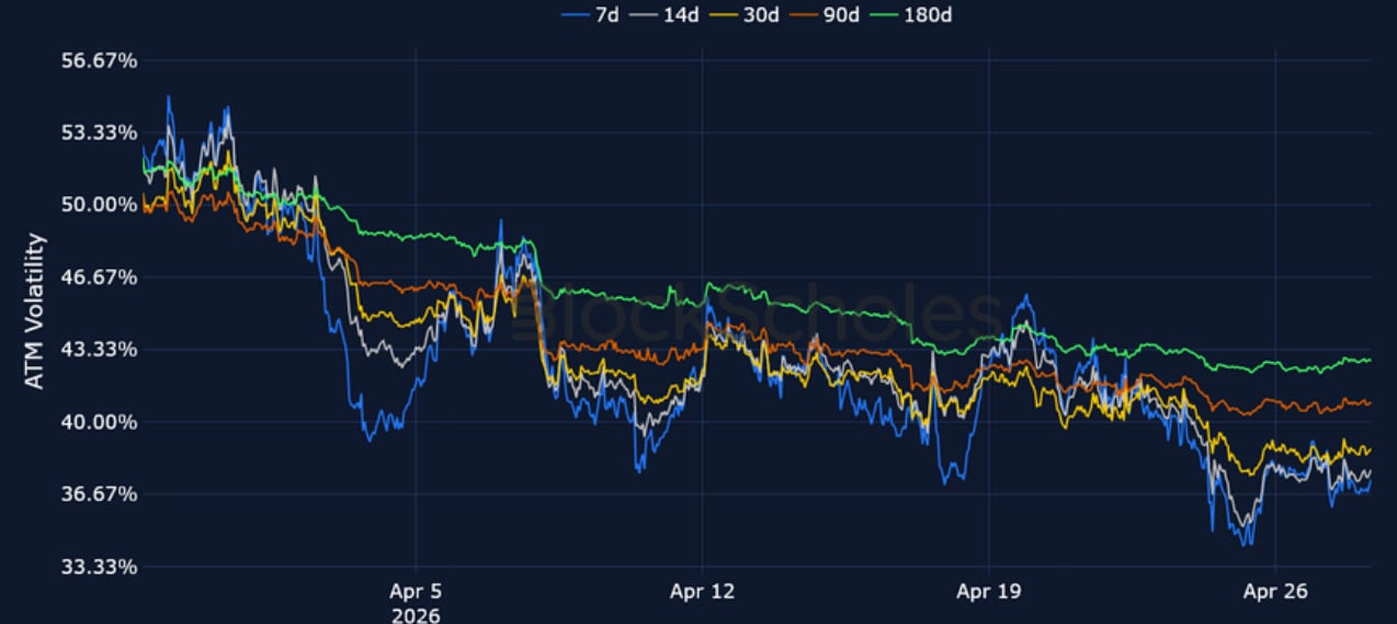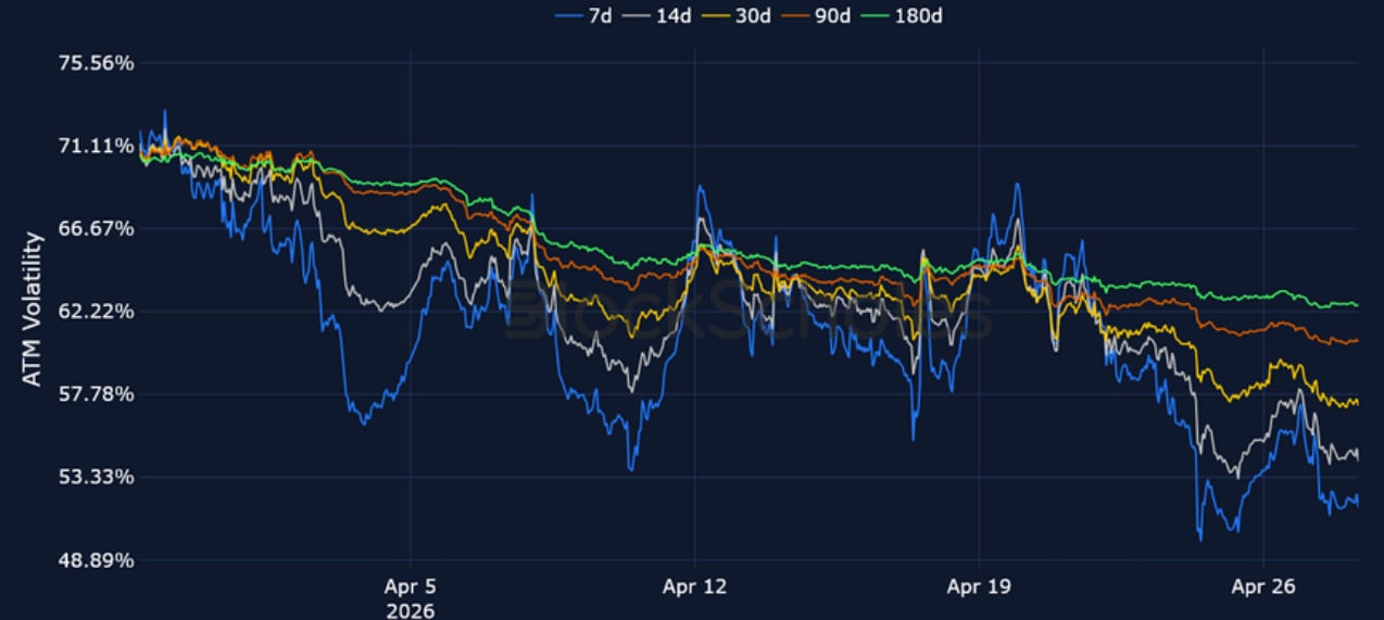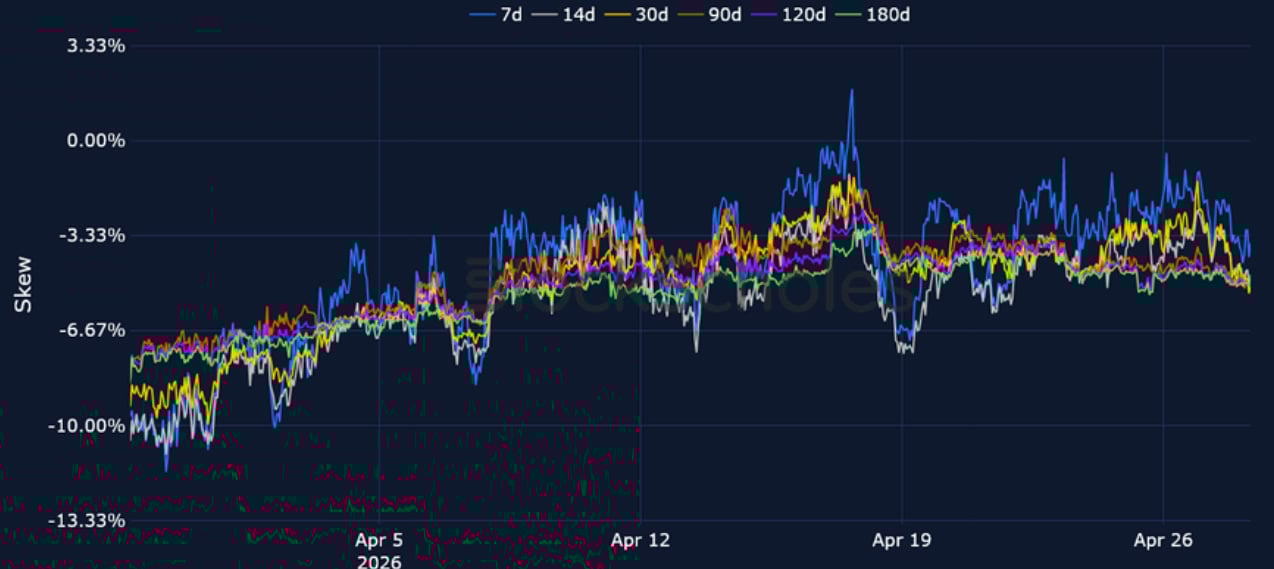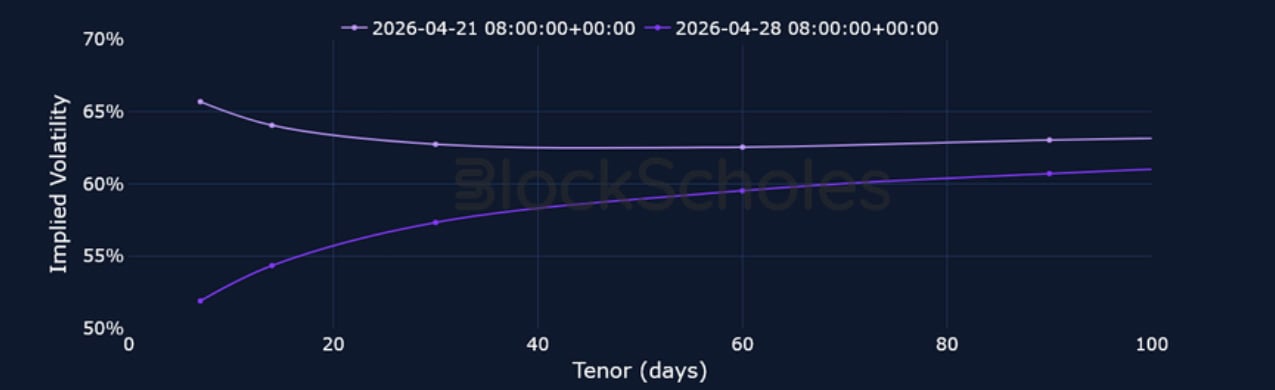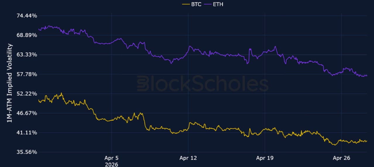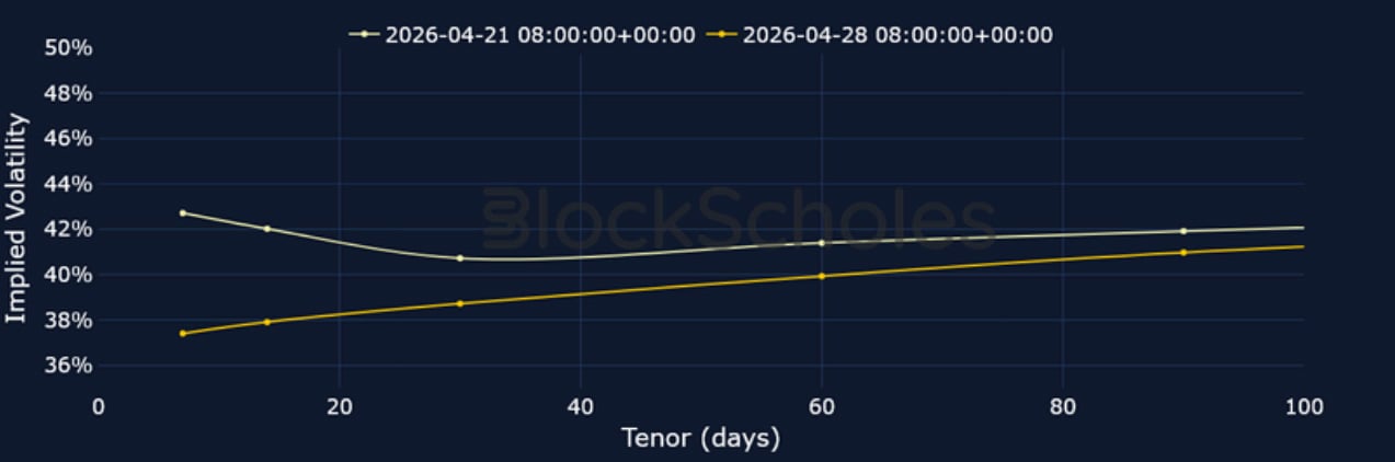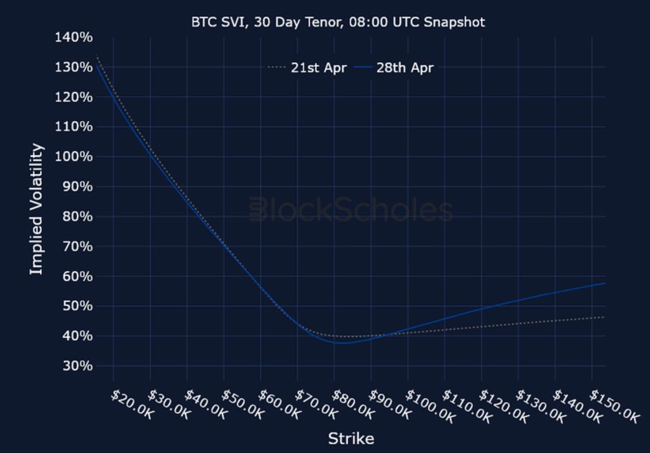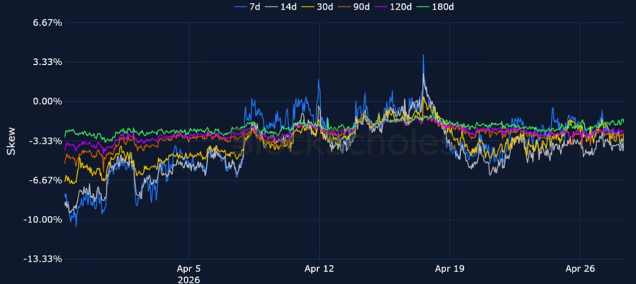 A 16% month-to-date rally has pushed BTC towards its highest level since the US-Iran war began. BTC reached a twelve-week high above $79K, driven by nine straight day of Spot ETF inflows as well as $2.8B worth of buying from Strategy. Block Scholes’ Risk Appetite Index for both BTC and ETH has surged towards 0.5 – a region which typically marks a more bullish regime. Despite the rally in spot markets however, derivative markets continue to fail to back the rally. Funding rates have yet to turn meaningfully positive, while the 25-delta skew continues to tilt towards put options. Historically, a rally in spot price of 15-16% over the past 20 days has seen a positive call-skew of 1-2% across BTC and ETH 7-day options. Meanwhile, implied volatility continues to selloff with 7-day ATM ETH implied volatility down 20 points from its April highs.