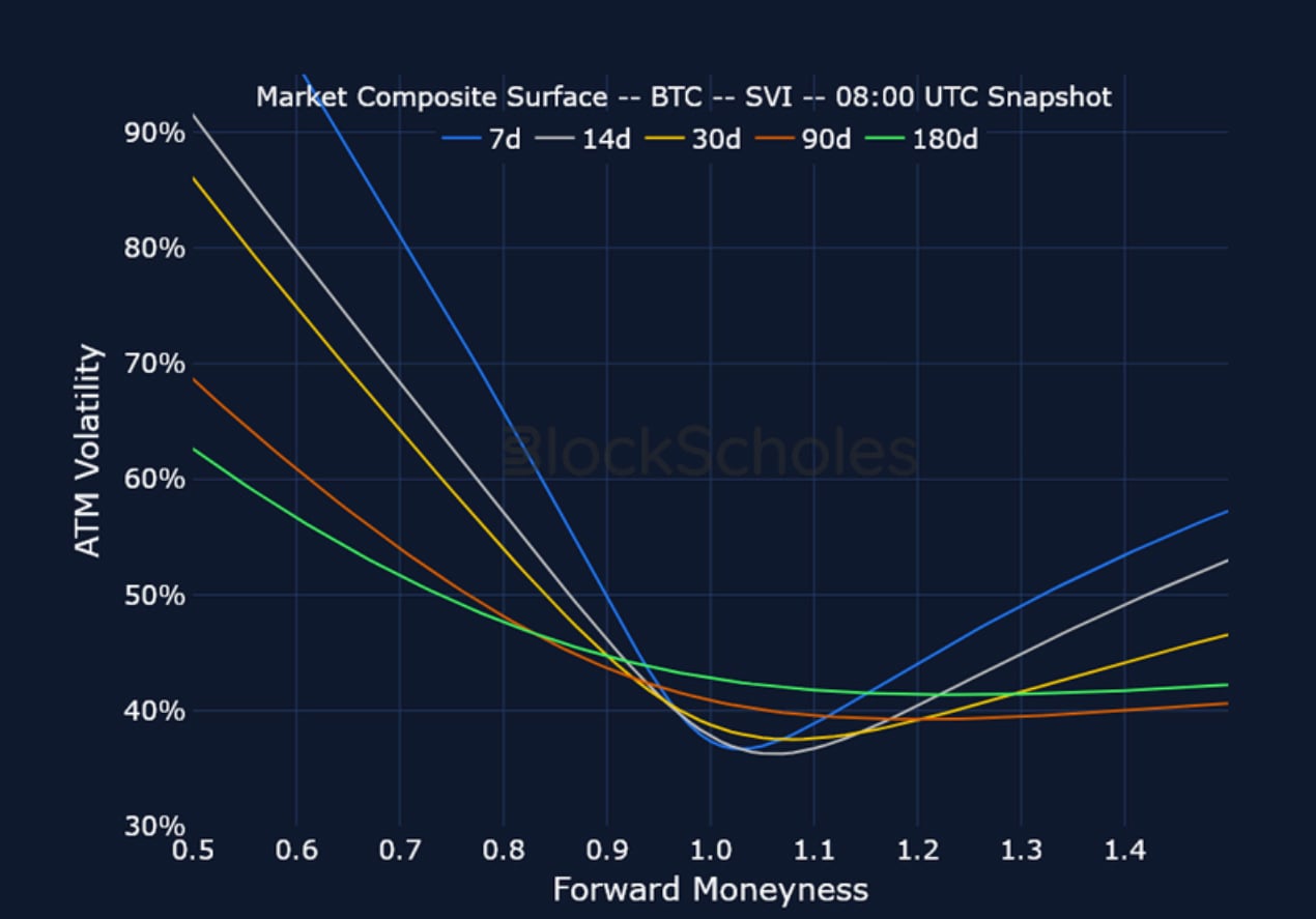 BTC SVI ATM IMPLIED VOLATILITY – Implied volatility continues to decline, driven by the front-end, resulting in a positively sloped term structure.