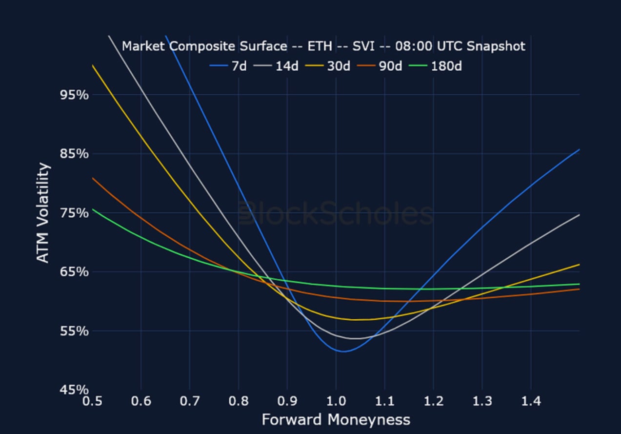 ETH SVI ATM IMPLIED VOLATILITY – Short-dated volatility has declined from its month-to-date highs of 71% and now trades close to 50%.