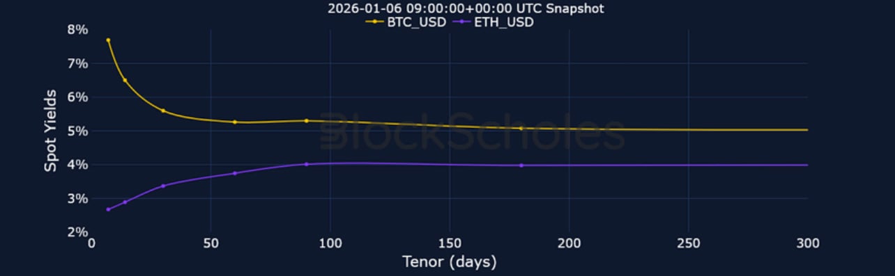 ETH Futures Implied Yields – Futures yields for ETH are positive at all tenors, though at lower outright levels compared to BTC.