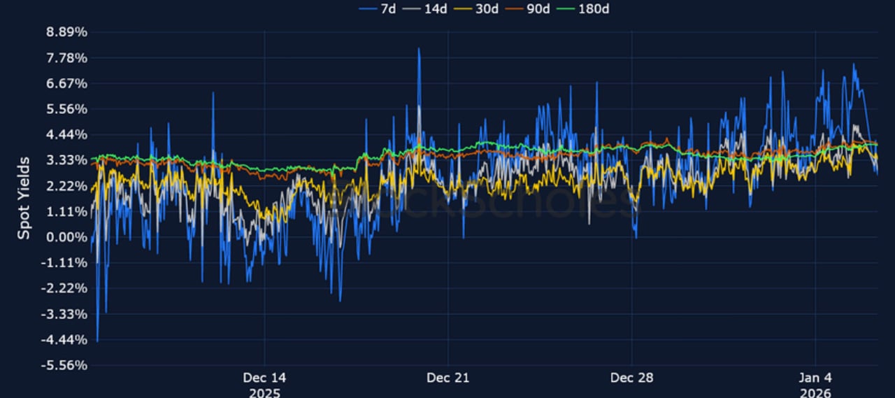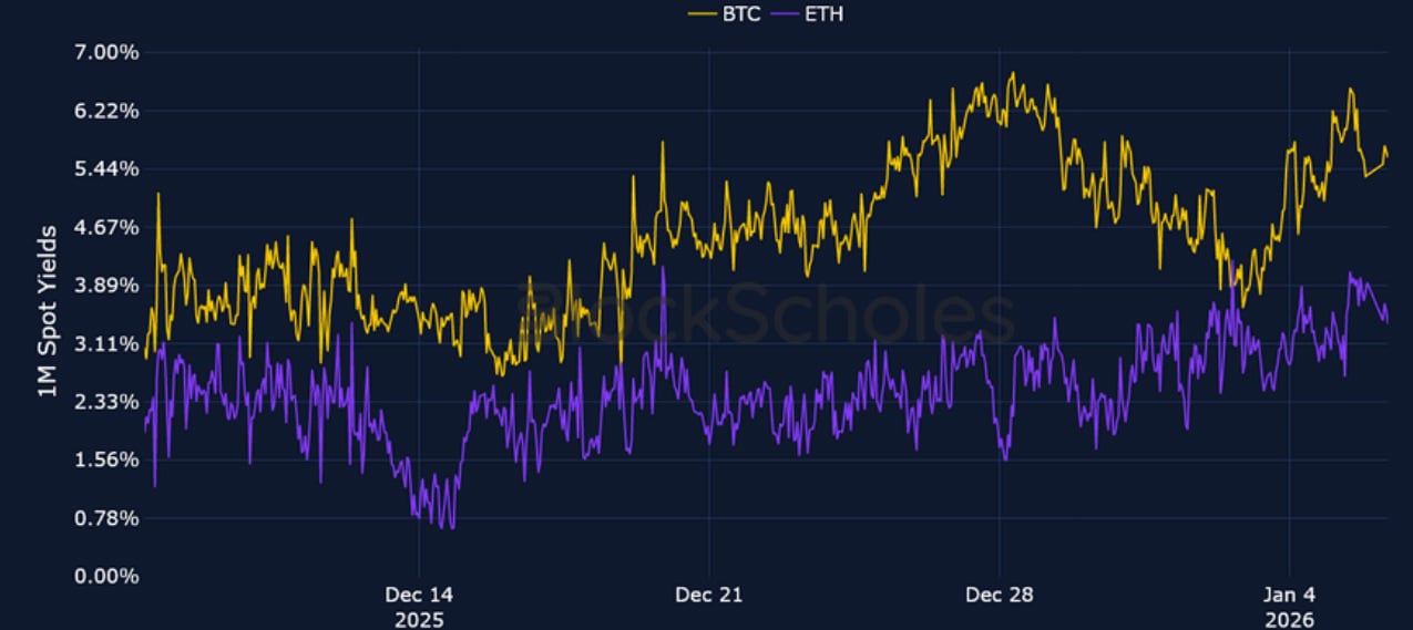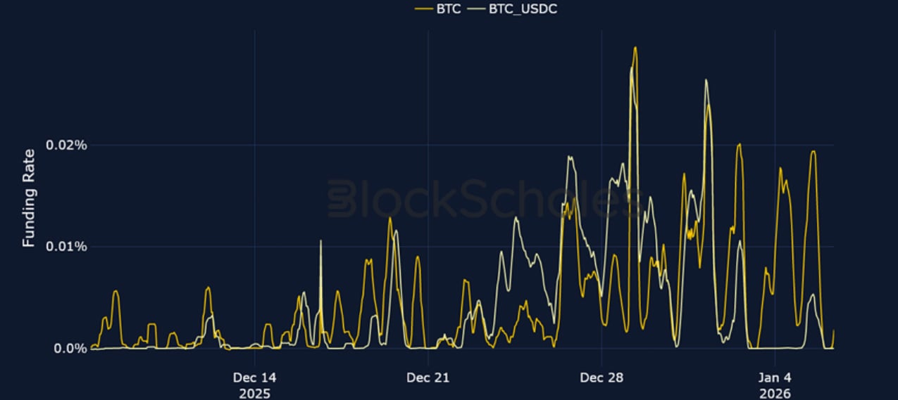 The volatility lull over the Christmas holiday period was slightly disrupted by a wave of weekend airstrikes and the capture of Venezuelan President Nicolás Maduro by the US. That resulted in 7-day ATM IV levels for BTC and ETH jumping 10 and 13 vol points respectively over the weekend. Despite the increased volatility, risk-assets rallied alongside precious metals. BTC is up 7.7% over the past week, while ETH is up more than 10%. The rebound in crypto spot prices has also coincided with early signs of recovering sentiment in Spot Bitcoin and Ethereum ETF inflows. On Monday, Spot BTC ETFs made their largest single-day purchase of BTC since October 7, 2025 ($697.2M). Perpetual funding rates have also been firmly positive over the past week, while the futures curve for BTC has inverted, as traders show a willingness to pay a premium over spot price for leveraged long exposure in the short- term. Our in-house Risk Appetite Index has also continued to tick higher, after forming a local bottom in the tail- end of last year.