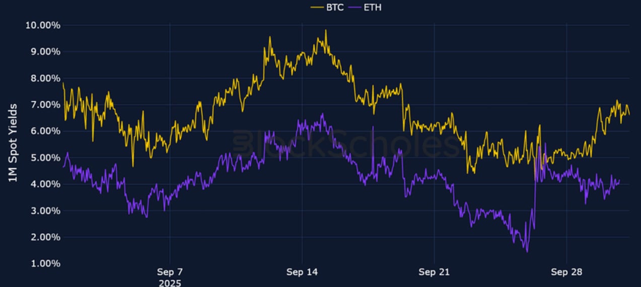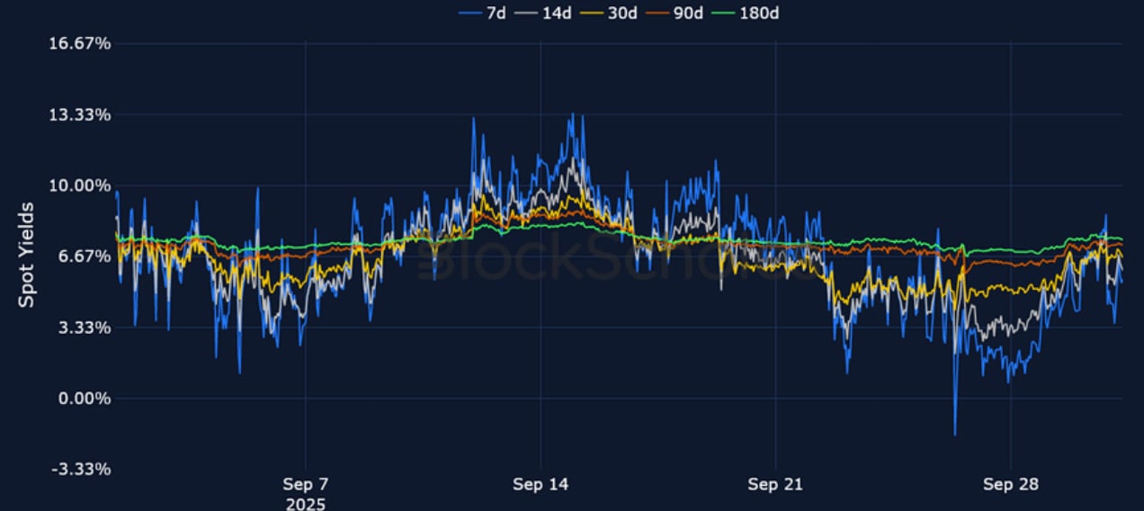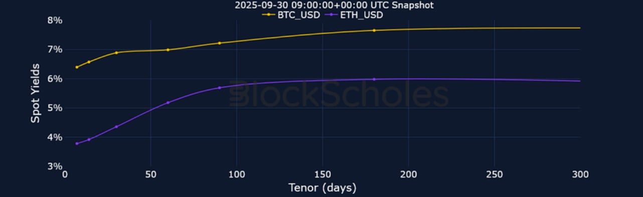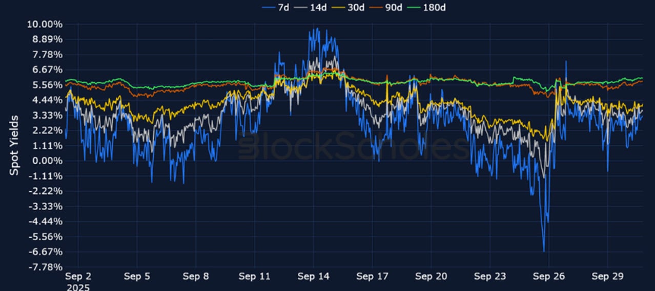 ETH Futures Implied Yields – Both funding rates and spot yields dipped sharply negative on Sept 25, 2025 when Ether fell to $3,800, a local bottom over the past month.