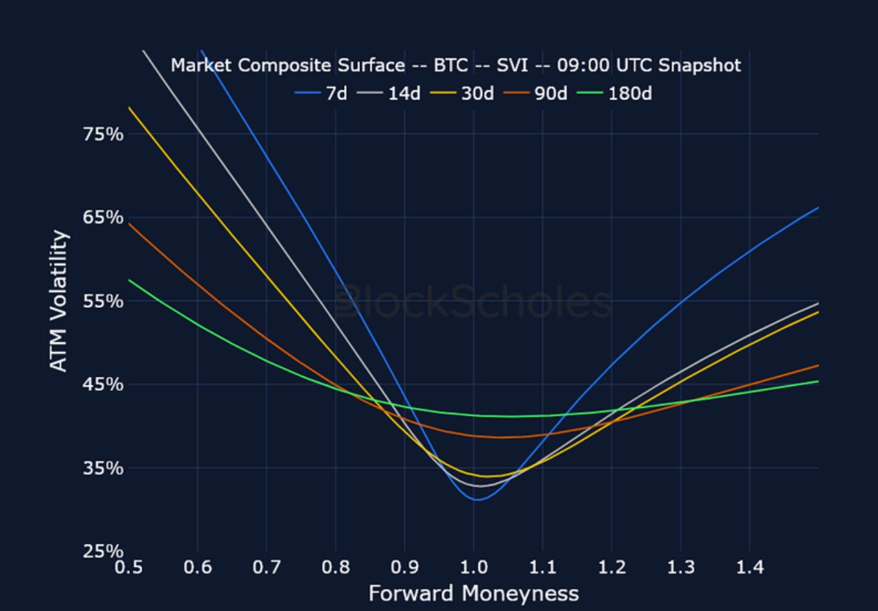 BTC SVI ATM IMPLIED VOLATILITY – Short-tenor ATM IV levels shot past 30% during the liquidation event last week, though have since traded sideways.
