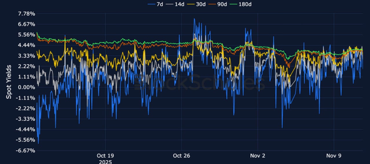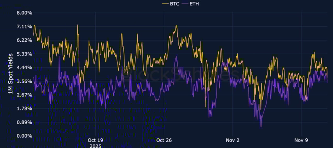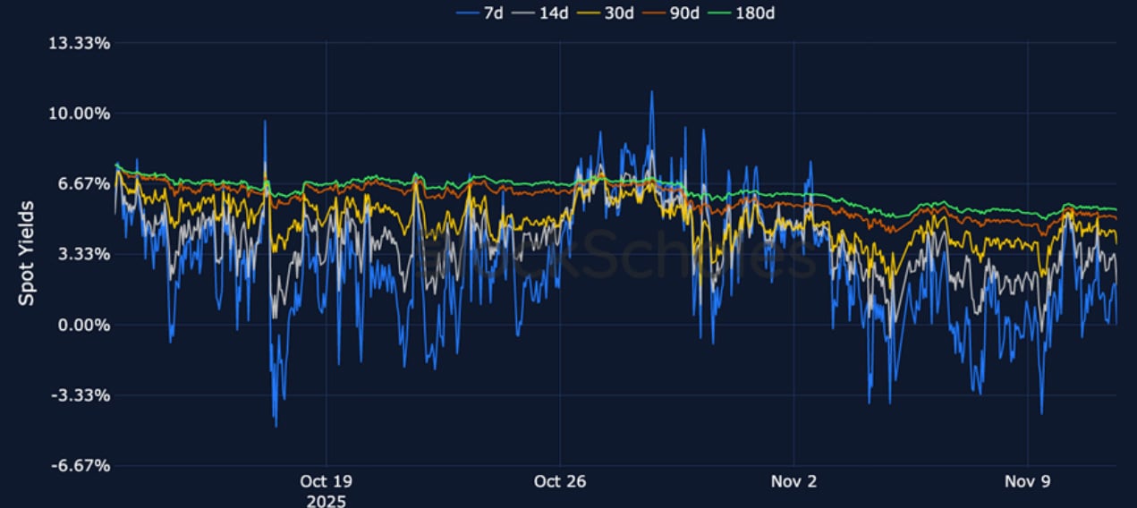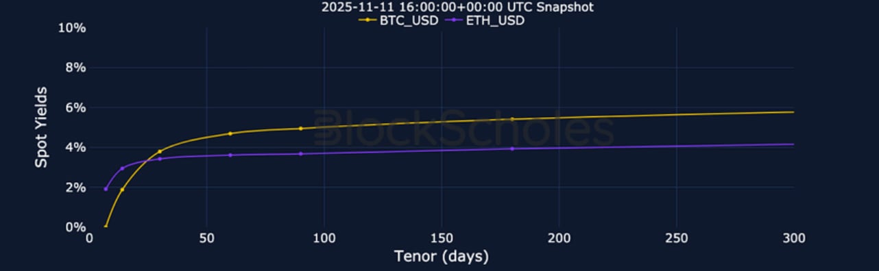 BTC Futures Implied Yields – Short-dated BTC futures trade very close to spot after a more sustained period of positivity at the end of October.