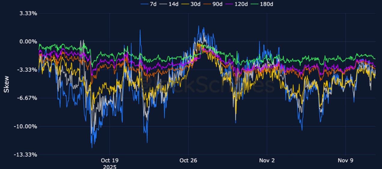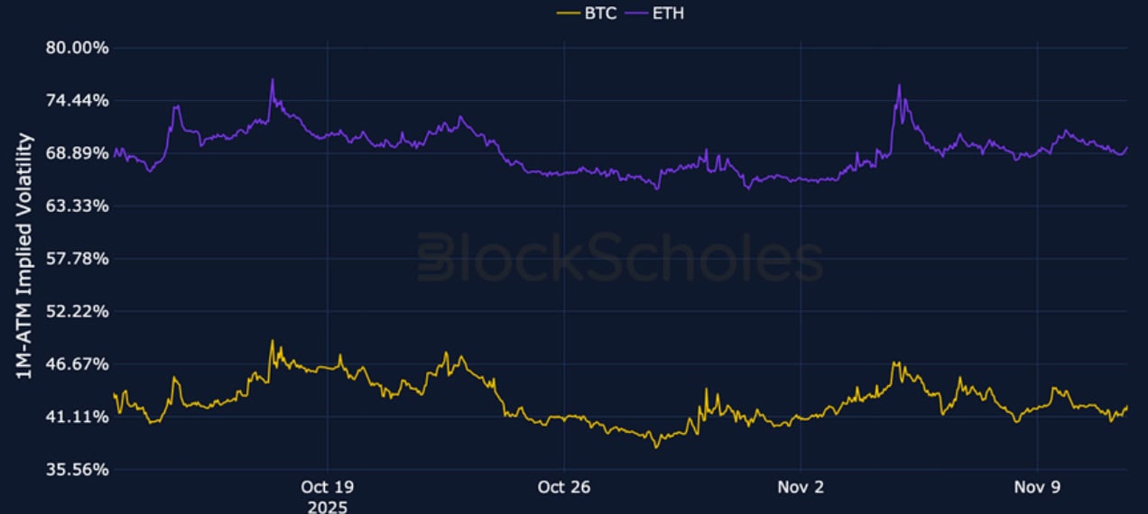 Despite staging small, late-weekend recovery rallies in spot markets, the derivative markets of BTC and ETH both present mixed pictures of sentiment. Perpetual swap funding rates are low but positive after a dip negative at the end of last week. Futures yields remain constructive, but indicate that futures prices hold almost no premium above spot price in short-dated BTC exposure. However, the skew of short-dated volatility smiles remains strongly towards OTM puts, and has not been buoyed by the move higher in spot. Volatility remains elevated in both markets, despite only ETH’s term structure sporting an inversion, as traders refuse to price-out the end of a volatile beginning to November.
