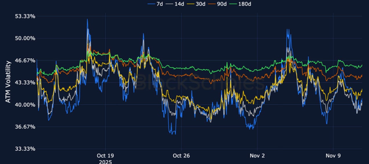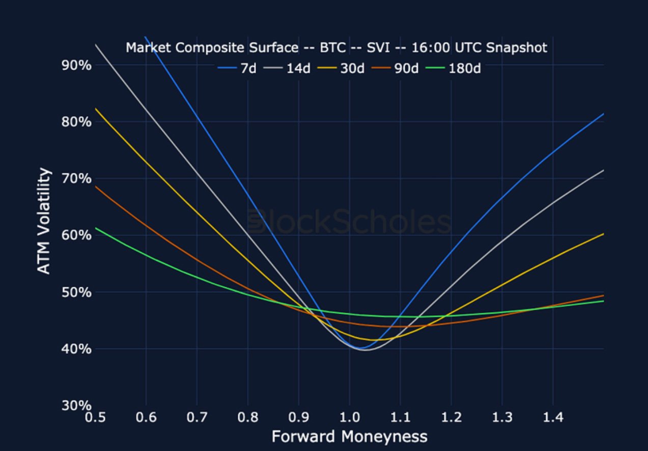 BTC SVI ATM IMPLIED VOLATILITY – The volatile moves that inverted ETH’s term structure have not had the same impact on BTC volatility surfaces.