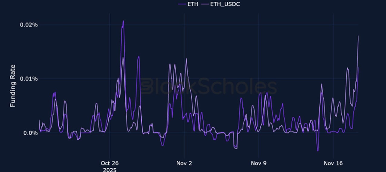 ETH FUNDING RATE – Despite trading 38% below ATH levels, funding rates in ETH contracts show a bullish picture, in stark contrast to its options markets.