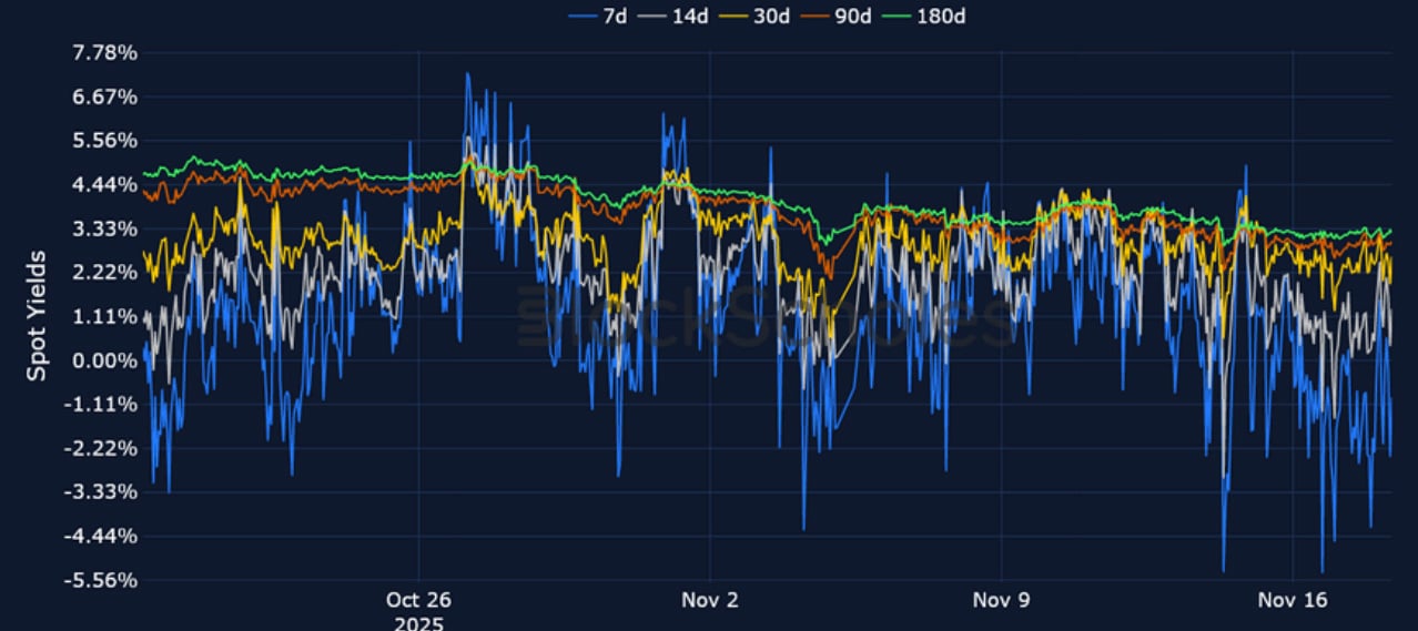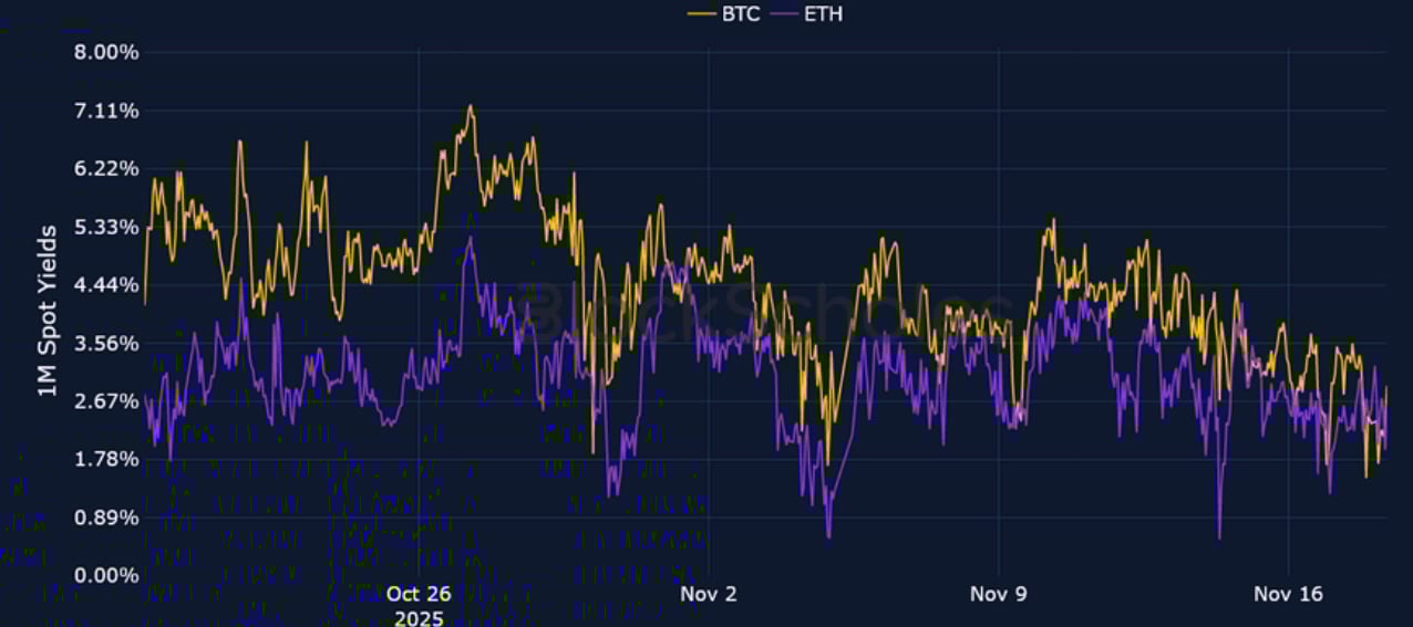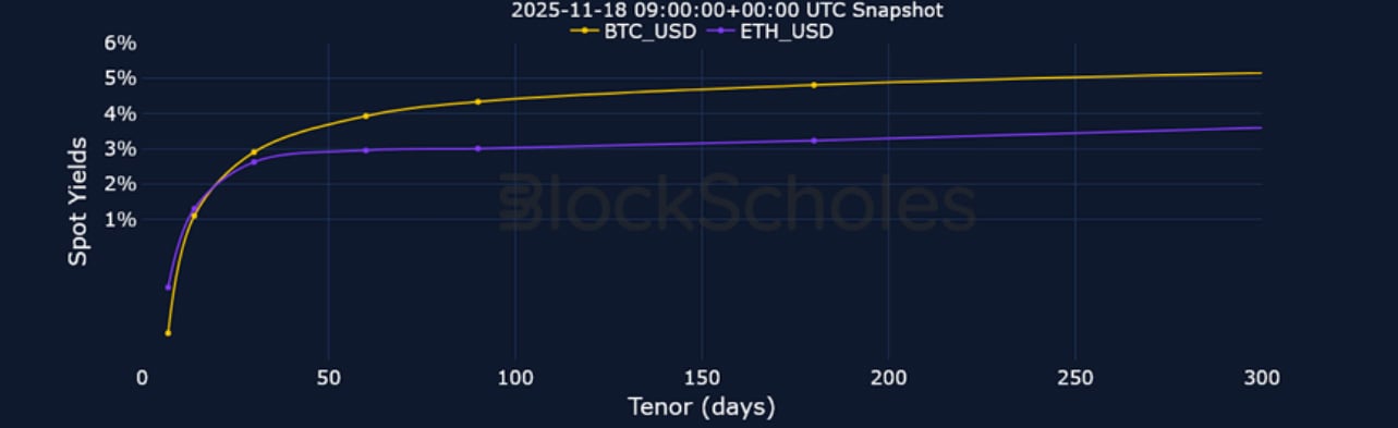 ETH Futures Implied Yields – Short-dated ETH exposure also shows futures prices below spot, though not to the same bearish degree as seen in BTC.