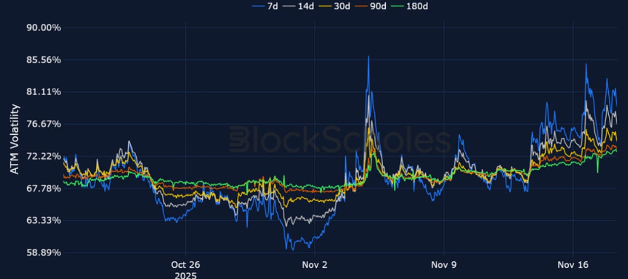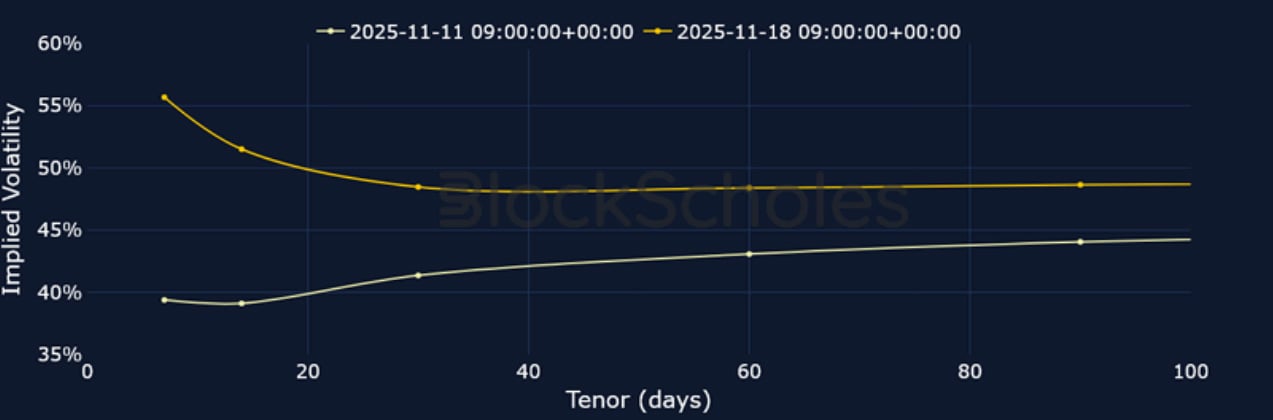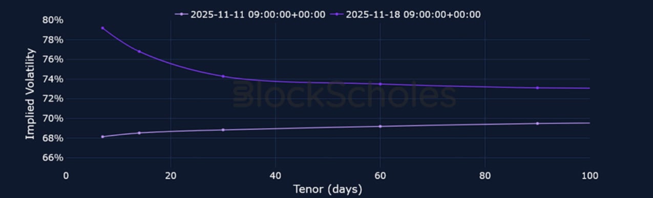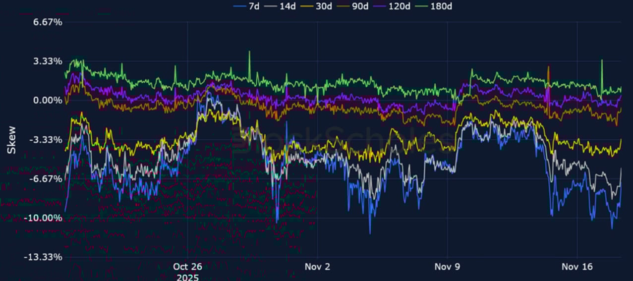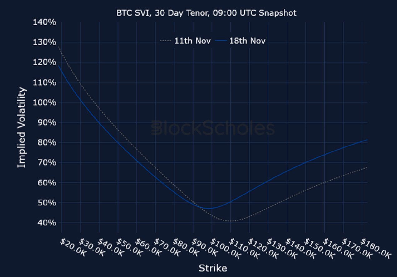 The past week has seen BTC hit a slew of new lows, with derivatives markets continuing to bet that the slide is far from finished. On Nov 14, 2025, BTC fell below $97K for the first time since early May 2025. That then extended to $93K – a level that meant BTC had erased all of its year-to-date gains – and then $89K. While the drop in crypto asset prices is part of a broader risk-off move amidst growing speculation over a potential AI bubble and Fed talk indicating a possible December rate pause, it is nonetheless crypto tokens that have been hit the hardest. As a result, implied volatility levels in both BTC and ETH options remain elevated, while volatility smiles have maintained a persistent skew towards downside protection. For ETH, the expectation of elevated volatility, particularly in the short-term, has meant an inverted term structure of volatility that has shown little signs of abating. In another sign of bearish sentiment, short-dated BTC and ETH exposure in futures markets show futures prices trading below spot prices, indicating that markets are willing to accept a lower price when shorting compared to the spot price.