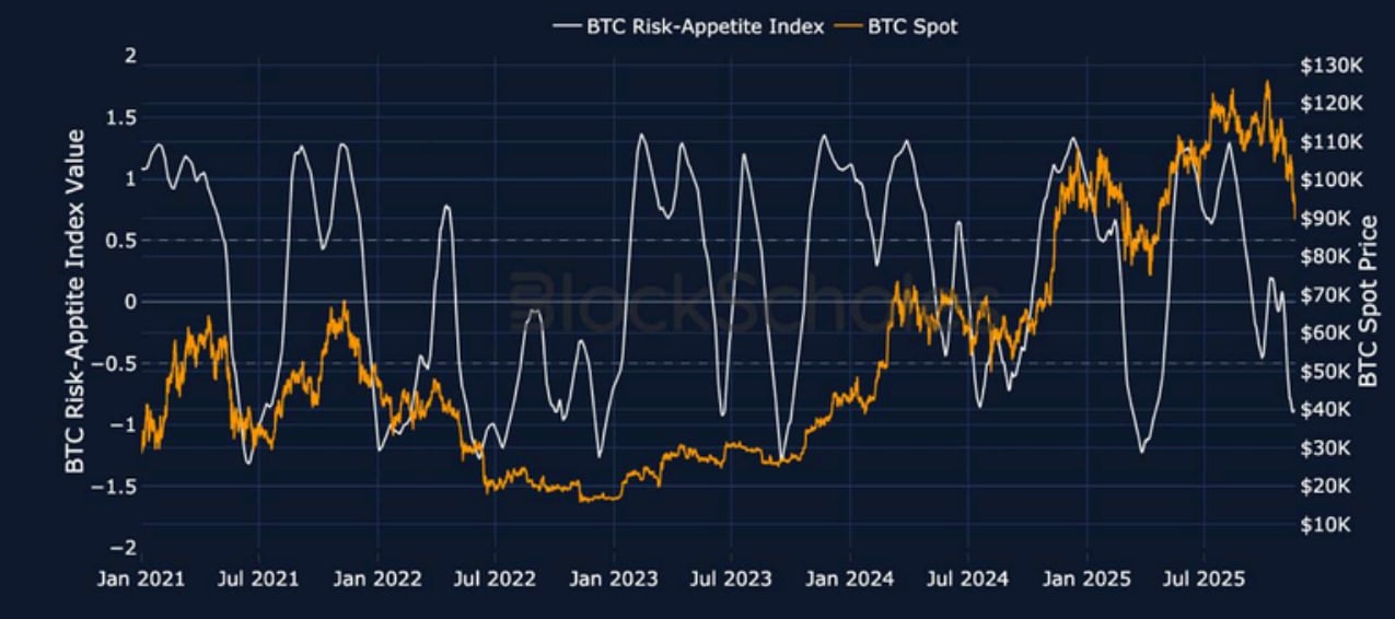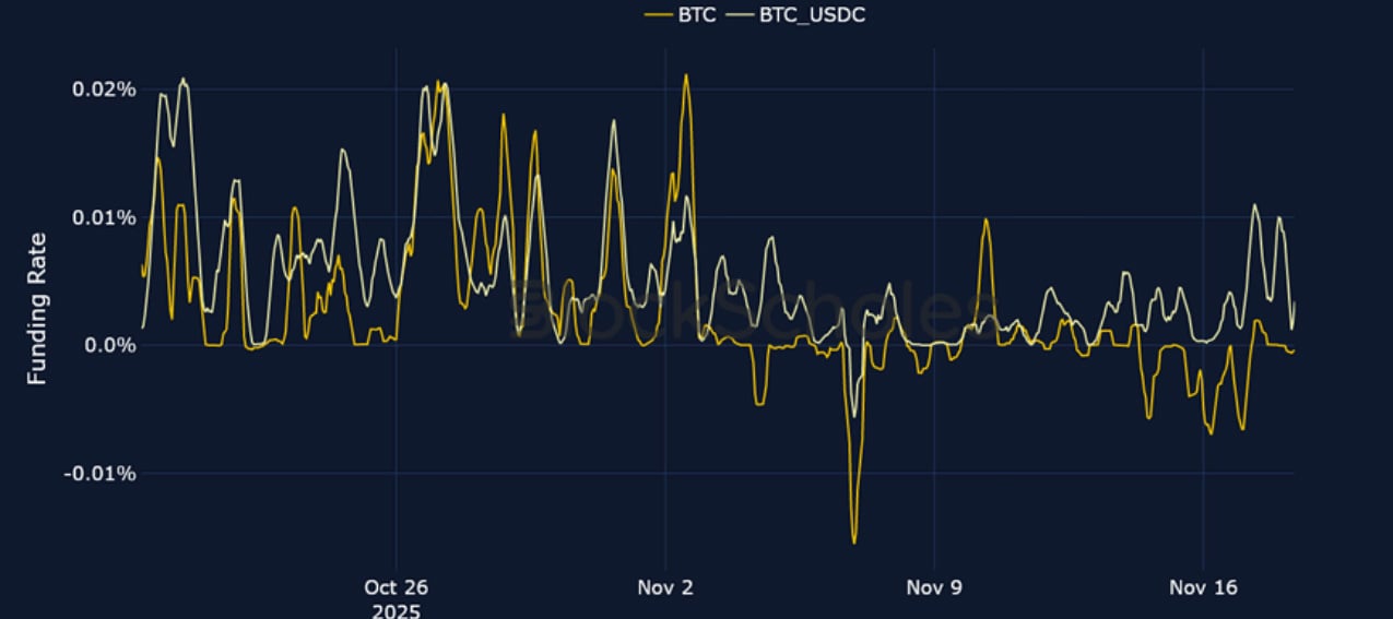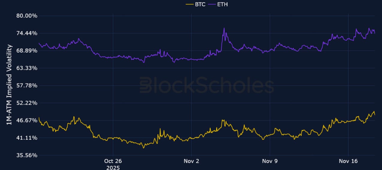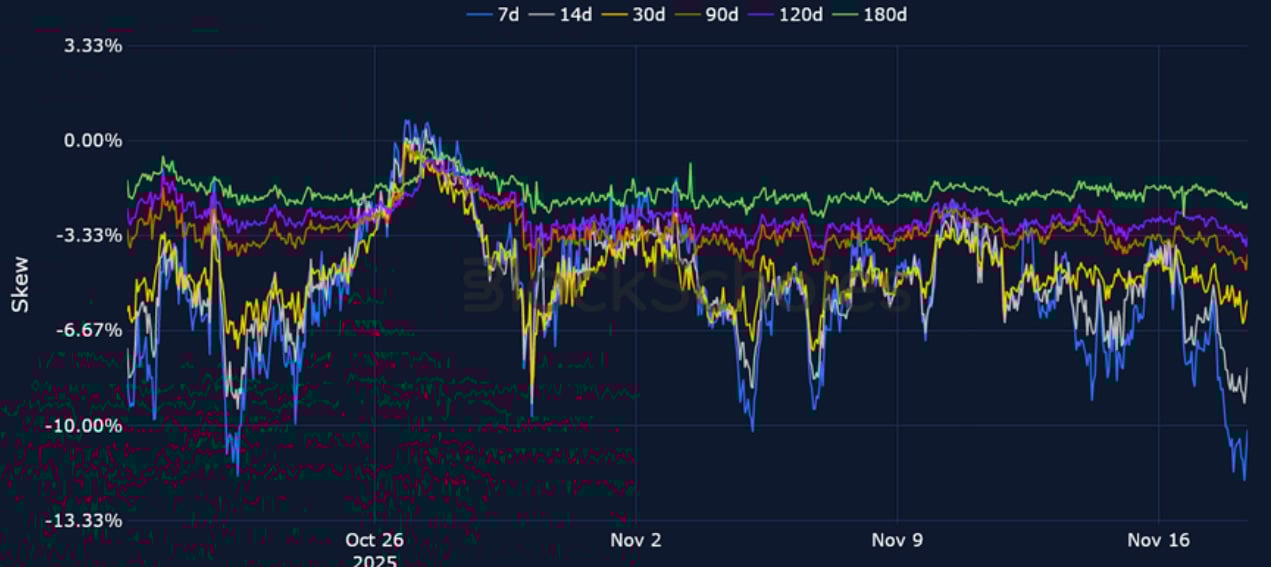 The past week has seen BTC hit a slew of new lows, with derivatives markets continuing to bet that the slide is far from finished. On Nov 14, 2025, BTC fell below $97K for the first time since early May 2025. That then extended to $93K – a level that meant BTC had erased all of its year-to-date gains – and then $89K. While the drop in crypto asset prices is part of a broader risk-off move amidst growing speculation over a potential AI bubble and Fed talk indicating a possible December rate pause, it is nonetheless crypto tokens that have been hit the hardest. As a result, implied volatility levels in both BTC and ETH options remain elevated, while volatility smiles have maintained a persistent skew towards downside protection. For ETH, the expectation of elevated volatility, particularly in the short-term, has meant an inverted term structure of volatility that has shown little signs of abating. In another sign of bearish sentiment, short-dated BTC and ETH exposure in futures markets show futures prices trading below spot prices, indicating that markets are willing to accept a lower price when shorting compared to the spot price.