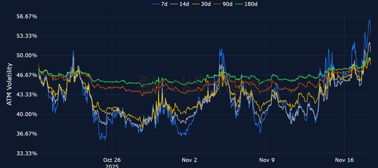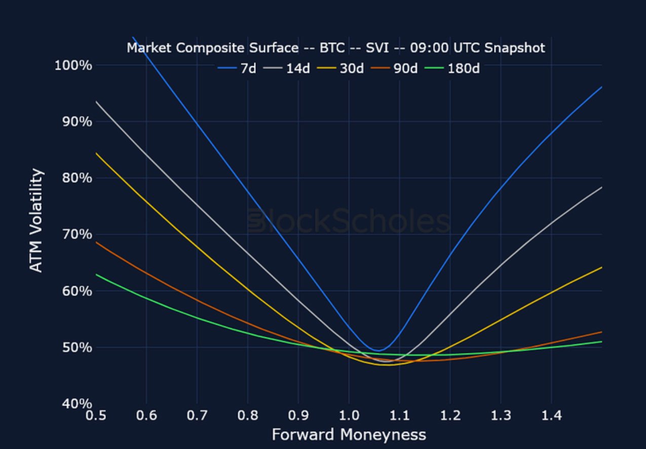 BTC SVI ATM IMPLIED VOLATILITY – Multiple drops below $100K and a year- to-date wipe out of gains has set the stage for an inverted vol term structure.