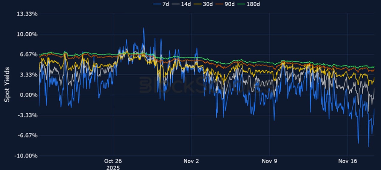 BTC Futures Implied Yields – Short-dated BTC futures (7-day) trade below spot price, suggesting a strong demand for short positions.