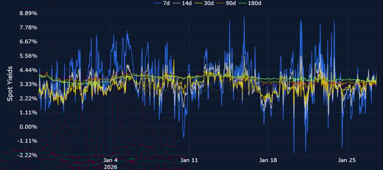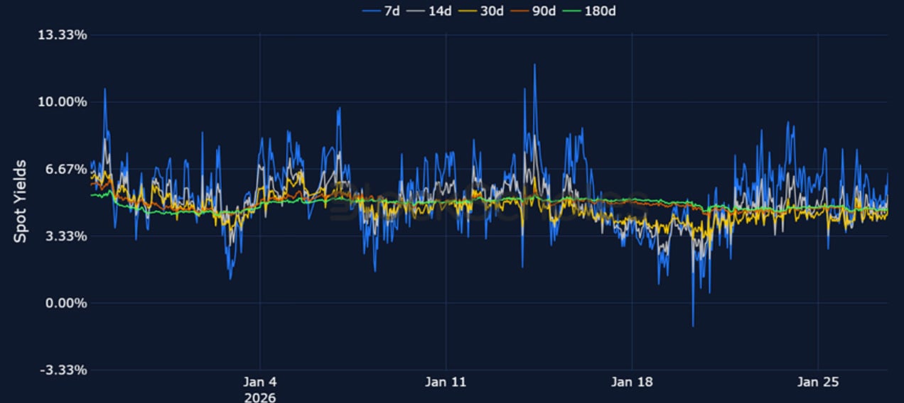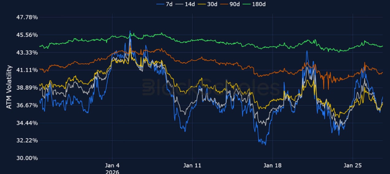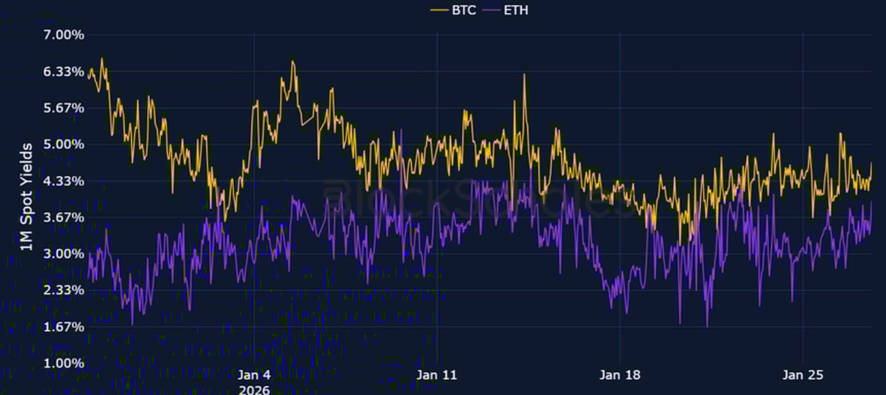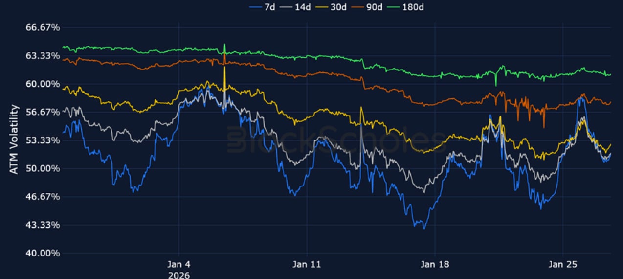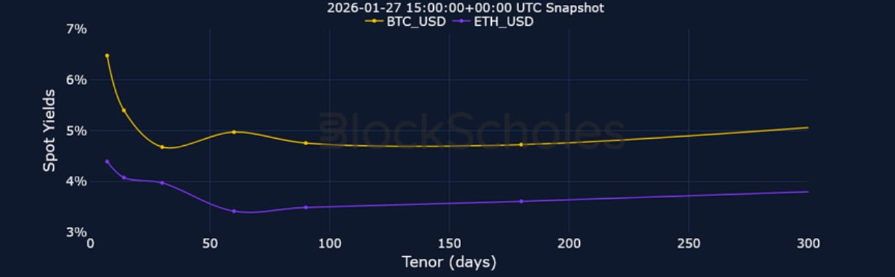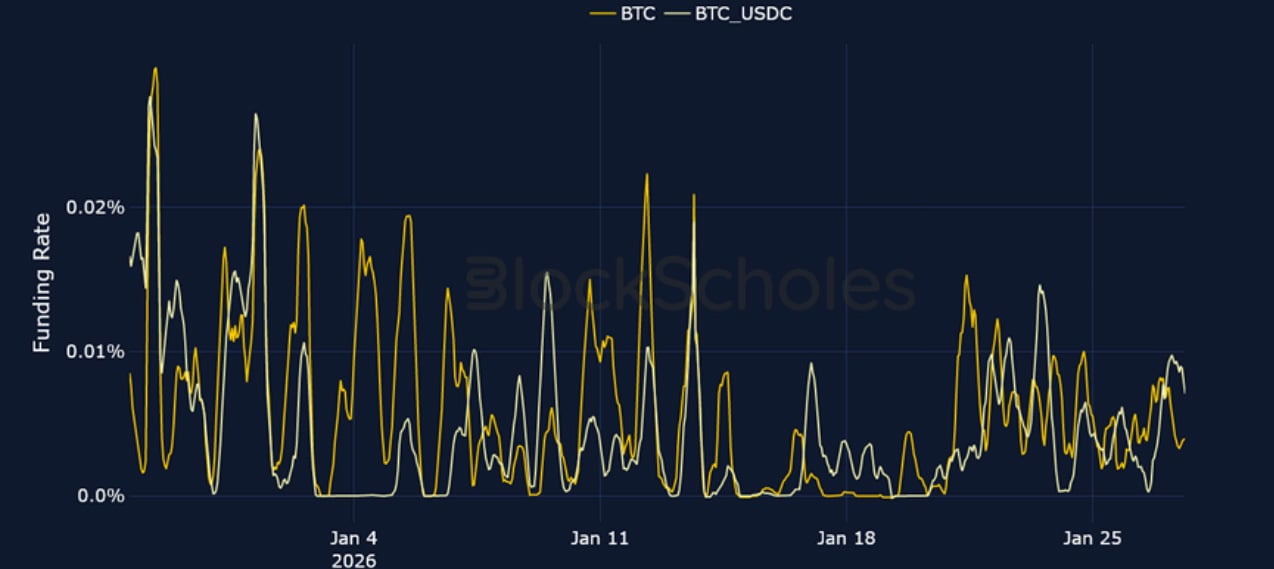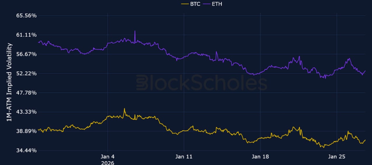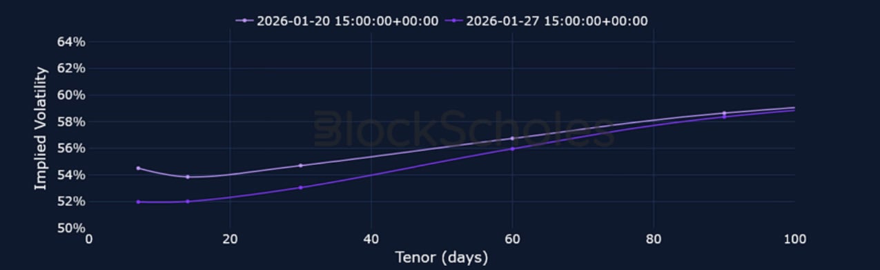 Short-tenor volatility for BTC and ETH briefly rose at the start of the week amidst the above mentioned macro events, though zooming out, 7-day ETH implied volatility trades at its lowest since October 2024, before the US election, while BTC volatility has continued to fall since its local peak in November 2025.