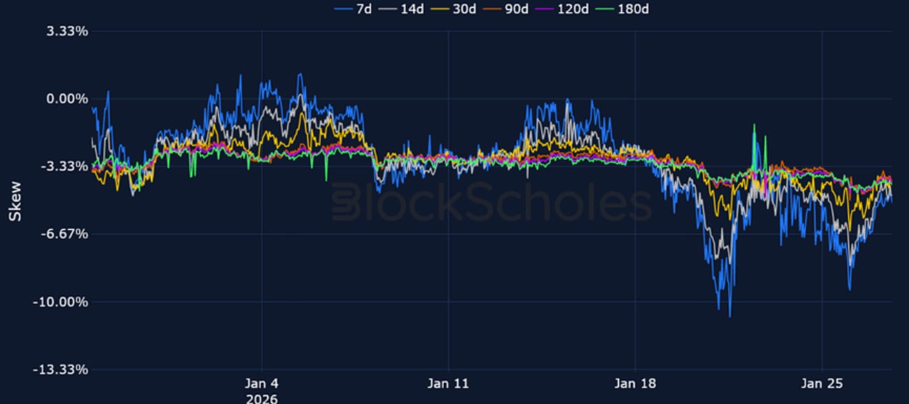 BTC 25-Delta Risk Reversal – Options markets continue to price in a bearish premium across the volatility surface, though skew has partly recovered since reaching -9% when BTC fell to $86K on Monday.
