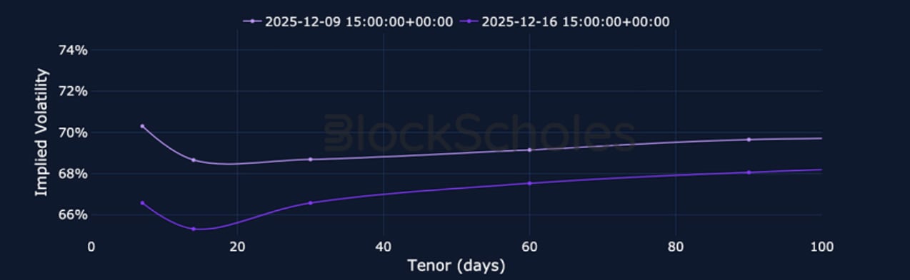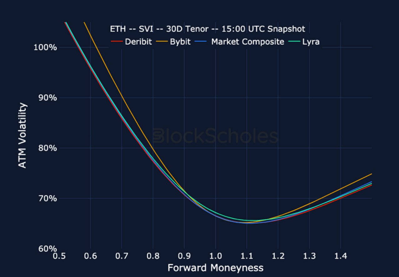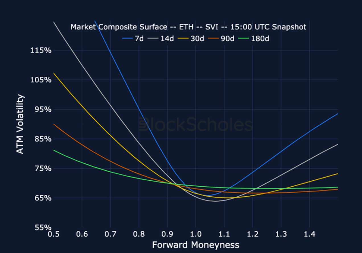 ETH SVI ATM IMPLIED VOLATILITY – While not inverted, volatility trades in a tight range between 65% and 68% across the term structure.