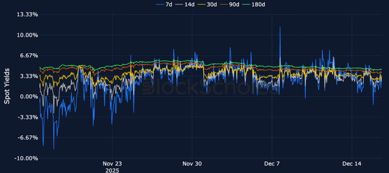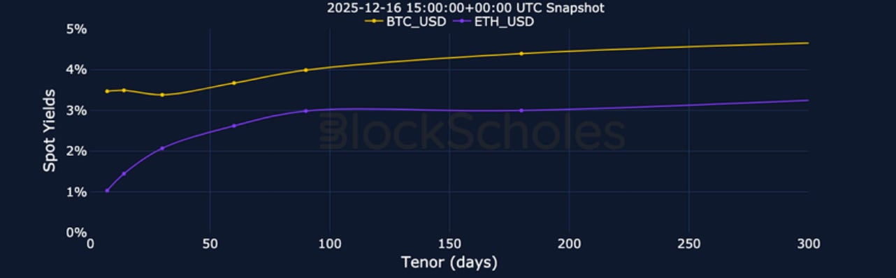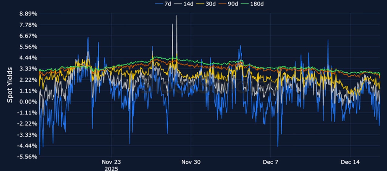 ETH Futures Implied Yields – Sentiment in futures markets remains bearish at short tenors, with 7-day futures frequently trading at prices below spot.