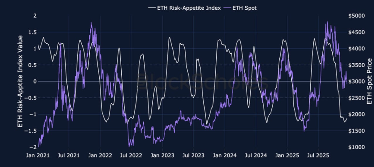 While key indicators in derivatives markets suggest slightly different sentiment for BTC and ETH, neither indicate a full recovery in sentiment. BTC holds the edge in futures and perps markets, with a higher pricing of futures contracts and a consistently positive funding rate, but options markets in BTC also hold a stronger put-skew relative to ETH’s. Volatility expectations are, as ever, higher for ETH, but are lower than their late November highs when traders rushed to put options. Our in-house risk appetite index has continued to linger near its historical lows for both assets – indicating that we are near to the most extreme levels of crypto sentiment.