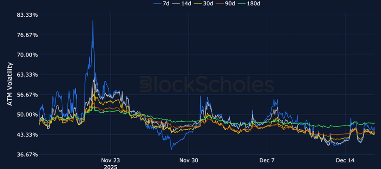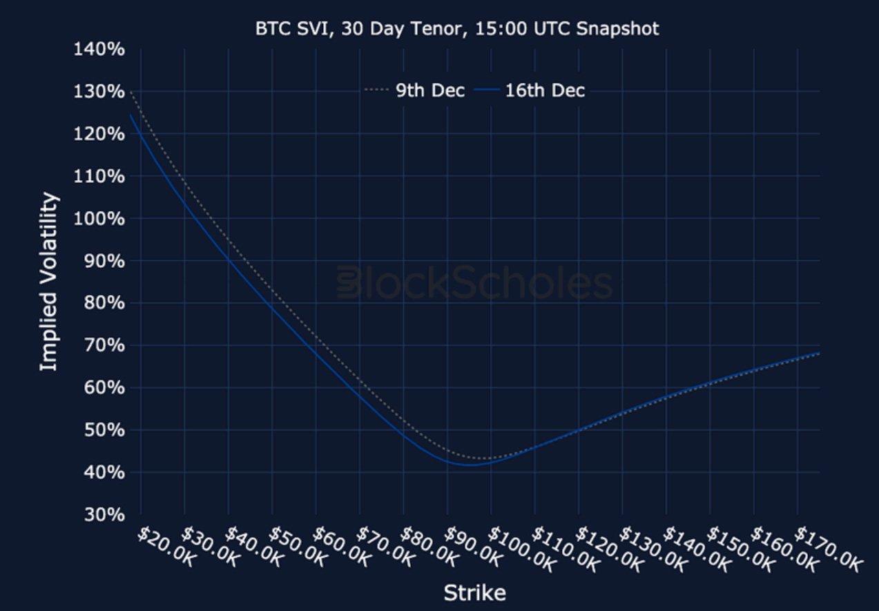BTC SVI ATM IMPLIED VOLATILITY – Volatility expectations remain elevated, despite short-tenor implied vols falling from their late November highs.