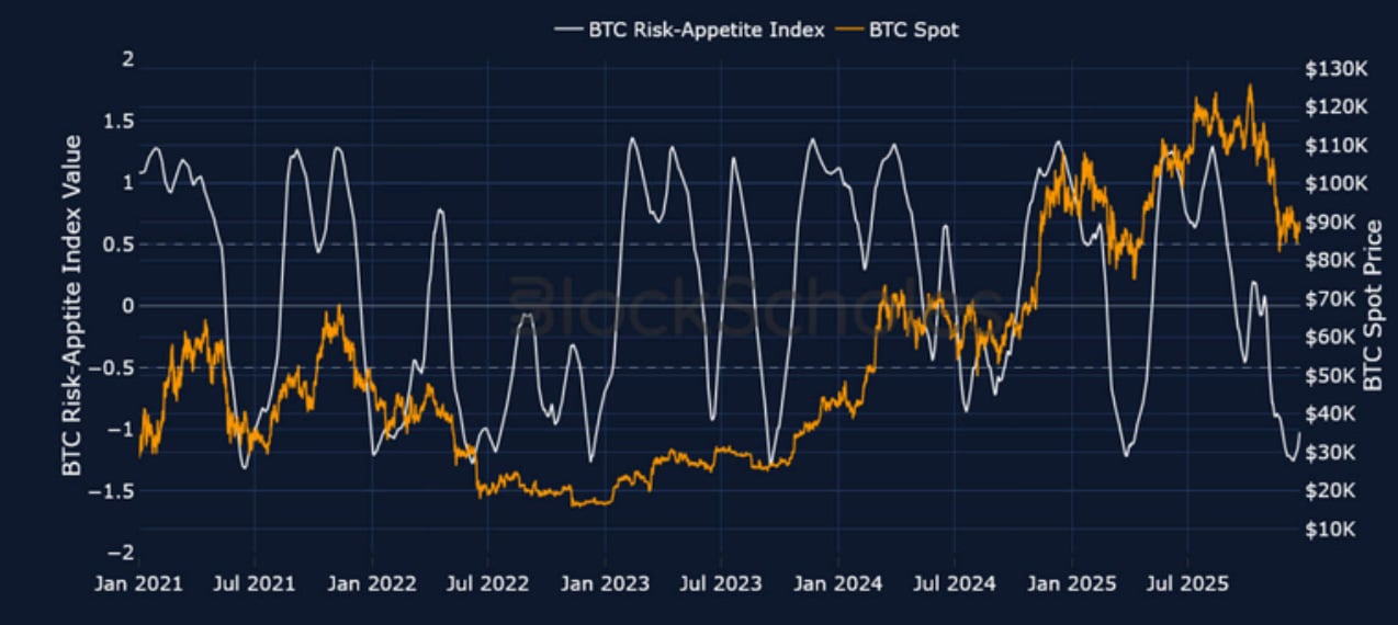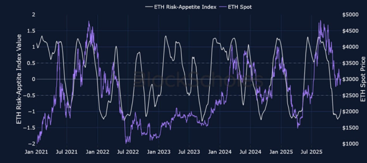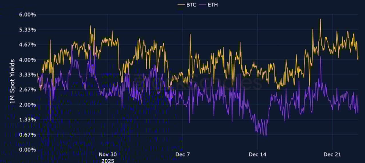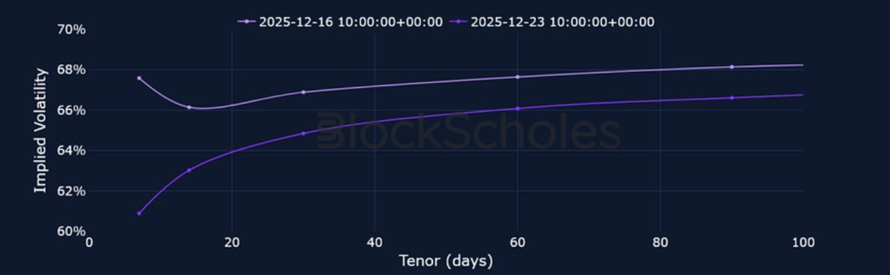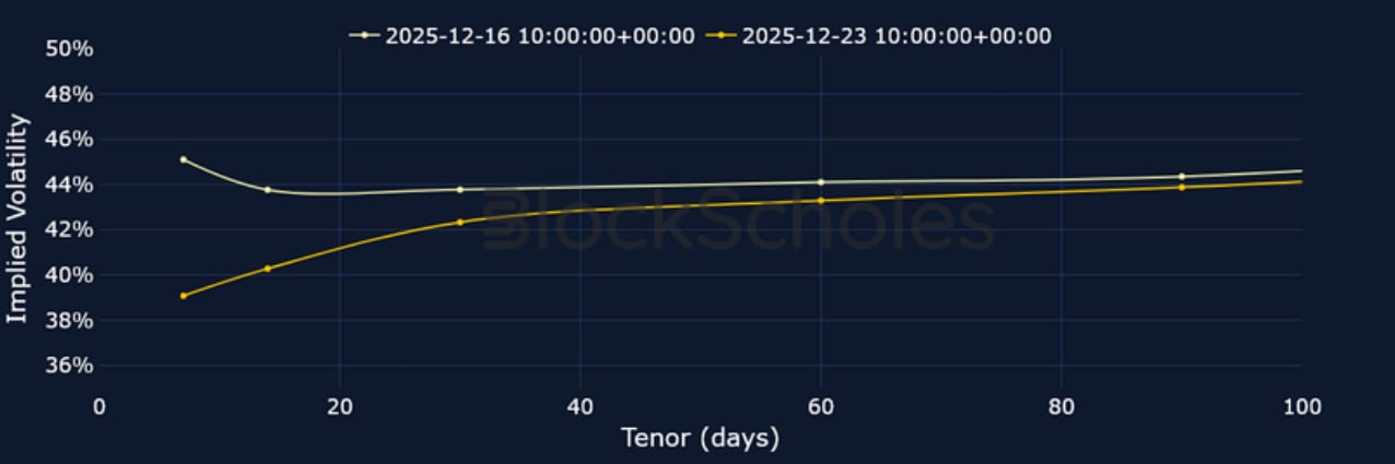 Similar to last week, derivatives markets point towards slightly differing levels of sentiment in the two majors. ETH funding rates shot up to their highest level since late November on Monday Dec 22, 2025 after reclaiming $3,000, though collapsed back to neutral levels just as quickly. However, futures markets point to a slightly higher pricing of BTC futures compared to ETH. On the other hand, despite option’s markets being bearish for both tokens heading into the new year and beyond, ETH volatility smiles assign a slightly less negative put-call skew premium at all tenors on the volatility smile. Expectations for volatility in options markets have also dropped – mirroring a similar decline in TradFi markets, with both the VIX index and the MOVE index close to their year-to-date lows. Finally, despite a relatively flat spot price over the past seven days for both BTC and ETH, our in-house Risk Appetite Index is increasingly showing signs of a bottom being reached, with risk-appetite now having bounced from historically low levels.