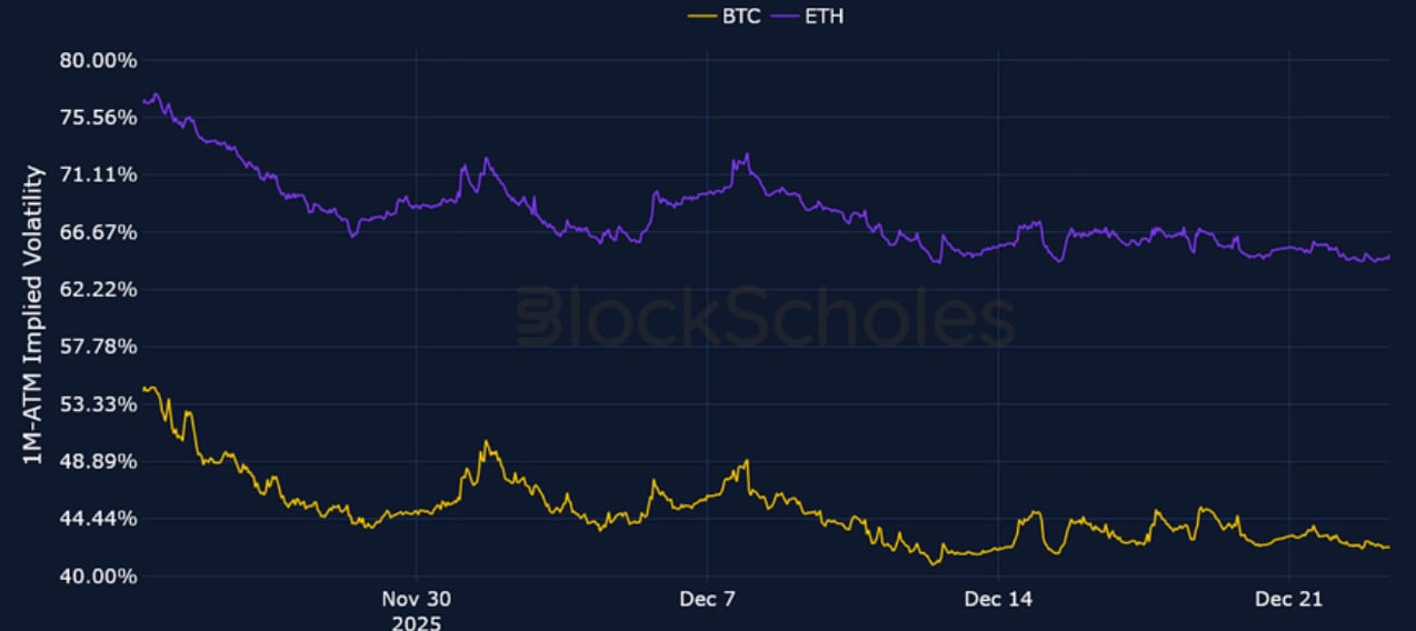BTC SVI ATM IMPLIED VOLATILITY – Short-tenor IV has continued to fall lower as we head into the new year and is now 20 points below late November levels.