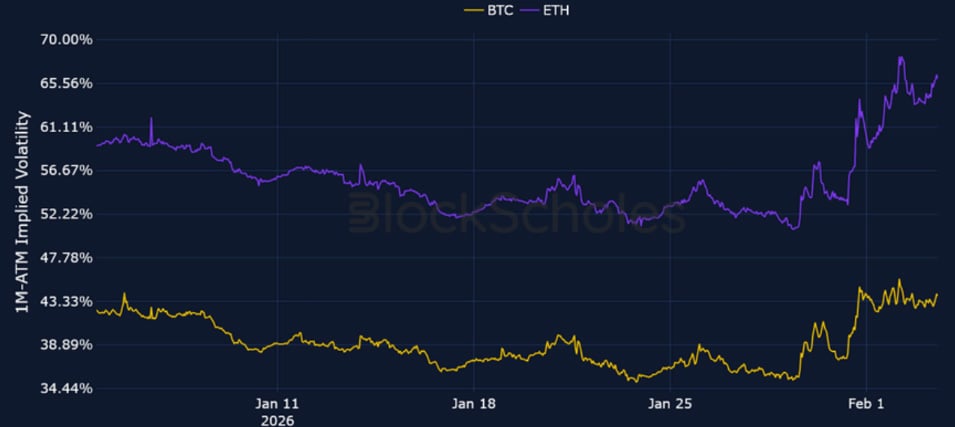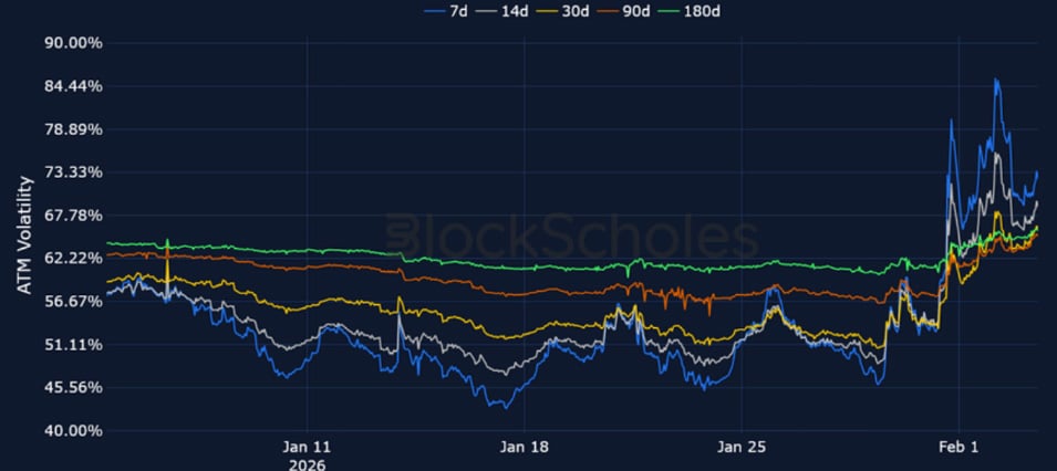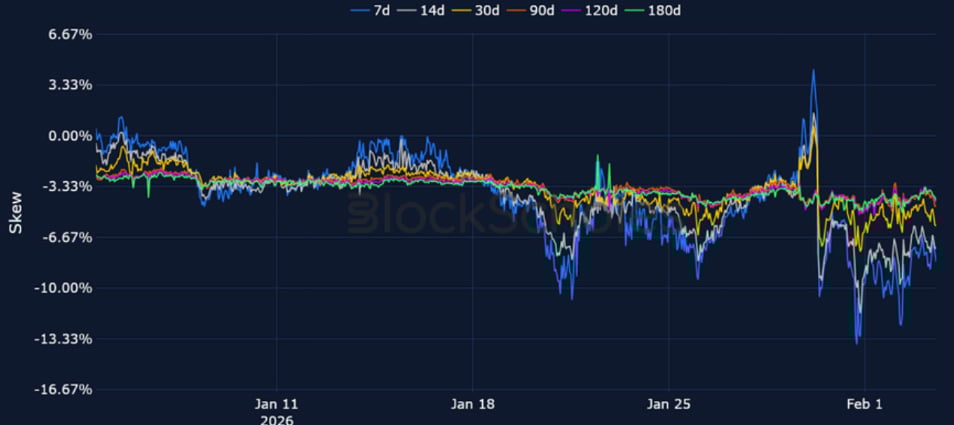 A major selloff in precious metals that saw silver prices plunge by their most in a single-day since 1980 spilled over into crypto markets over the weekend. That resulted in BTC revisiting $74K – a level it last traded at in the aftermath of the Liberation Day tariffs in April 2025 and nearly 40% below its October all-time high. The weekend selloff was the largest in crypto since October 10, 2025, seeing the most liquidations since that date. As such, the extreme bearish positioning across derivatives markets is perhaps unsurprising, with each measure of directional sentiment pointing towards further panic: short-dated ETH skew fell to its lowest since April 2025, funding rates on perpetual futures contracts fell below 0% for both BTC and ETH, and near-dated futures-implied yields also traded at a discount to spot.