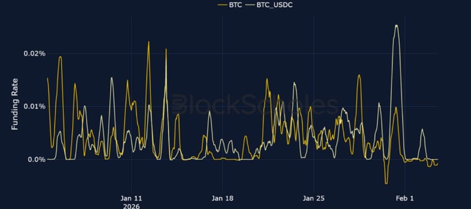 BTC FUNDING RATE – The selloff in precious metals spilled over into crypto risk sentiment, pushing BTC funding rates negative in a sign of extreme bearishness.