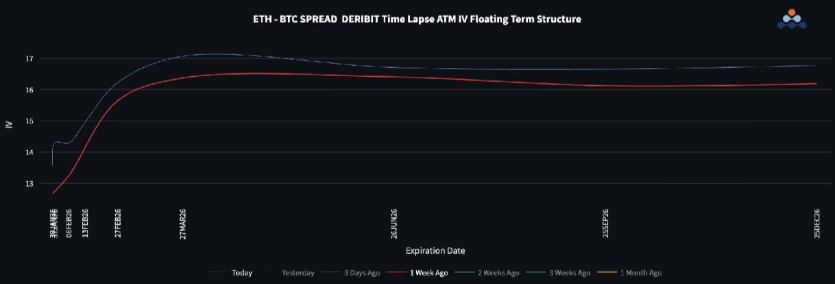Volatility tells a more constructive story. ETH implied and realized volatility have held up better than BTC, keeping the vol spread elevated. With realized vol differentials still wide, long ETH gamma versus BTC gamma remains attractive for active hedgers. In the absence of a strong directional catalyst, relative vol continues to offer cleaner risk-adjusted opportunities than outright spot exposure.