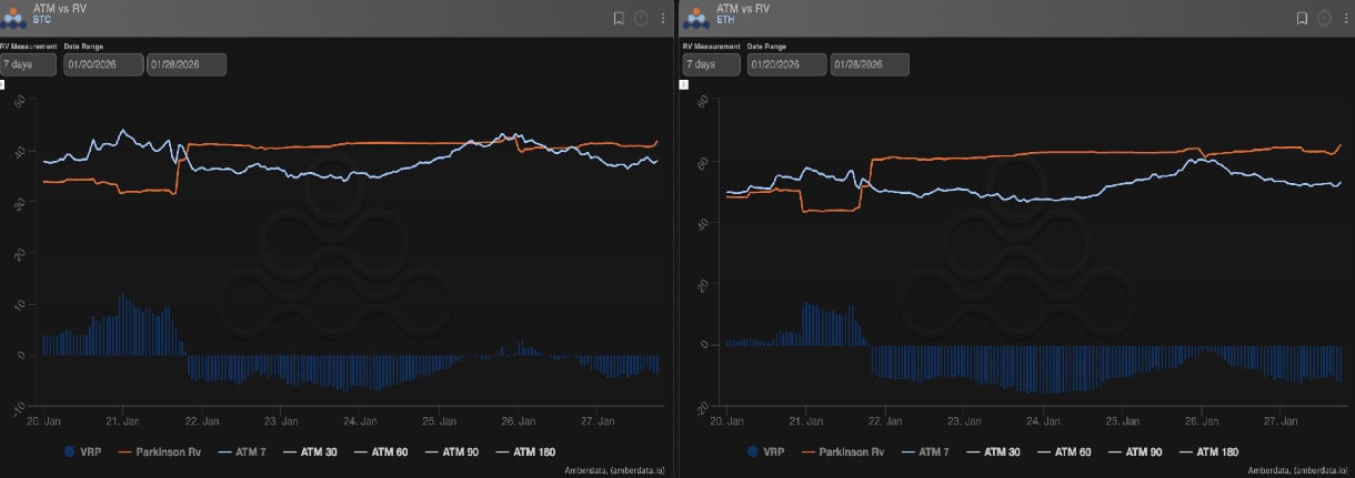 Realized volatility remains high, reflecting the sharp downside move seen recently—roughly in the low-40s for BTC and around 60 for ETH. These levels are backward-looking but still influential, keeping vol metrics elevated even as spot price action begins to stabilize.