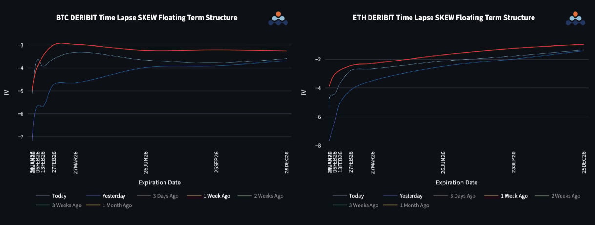 The volatility term structure reflects near-term caution rather than outright panic. Skew deepened into contango during the sell-off, with front-end put skew becoming meaningfully bid as spot weakened. Although the subsequent bounce reduced some of this stress, downside skew remains elevated relative to the start of the week.