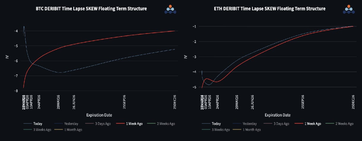 The skew term structure reflects a market that is still pricing risk but without urgency as the BTC curve inverted this week.
