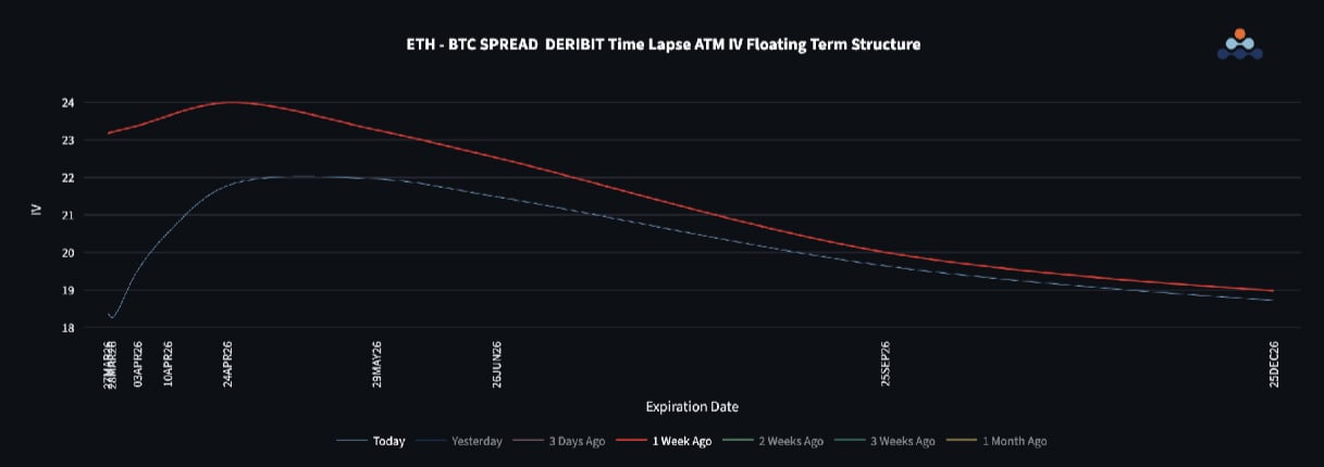 Volatility spreads between ETH and BTC have narrowed, reinforcing the idea that ETH’s outperformance was flow-driven rather than structural.