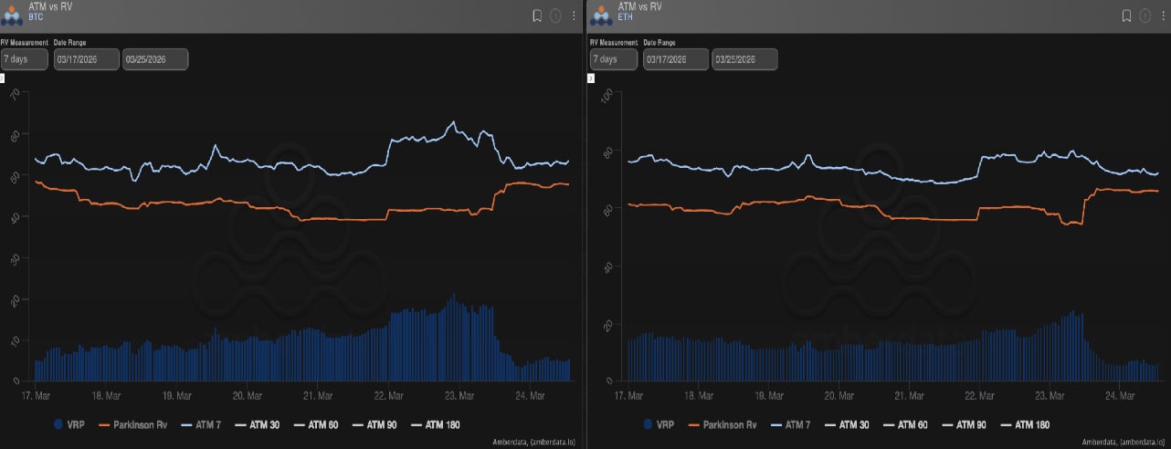 Realized volatility has remained relatively steady, with BTC around 50 and ETH slightly higher around 60. Implied volatility is still above realized, keeping carry positive, though that spread is beginning to compress.
