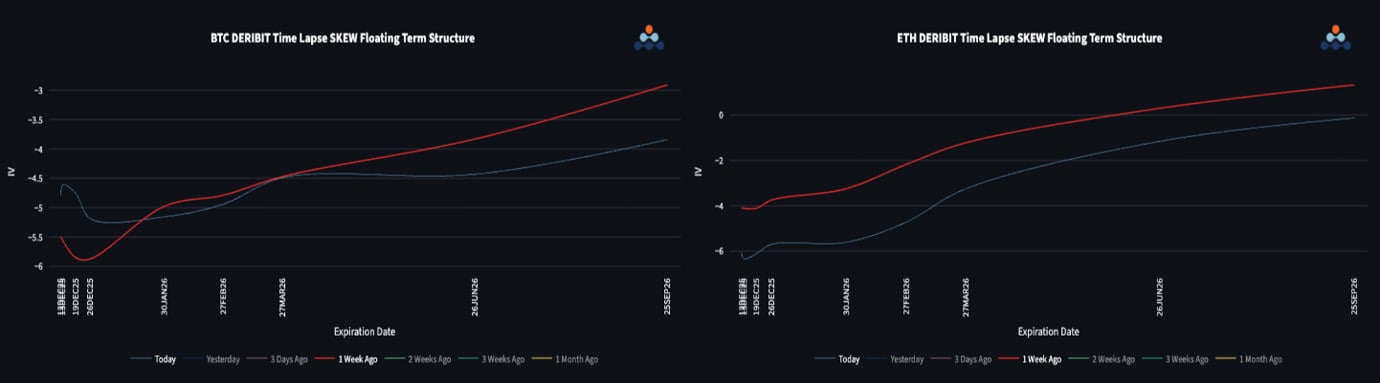 Skew remains in contango: near-dated puts are bid relative to calls. The long-end BTC put skew keeps grinding higher, likely reflecting institutional hedging demand.