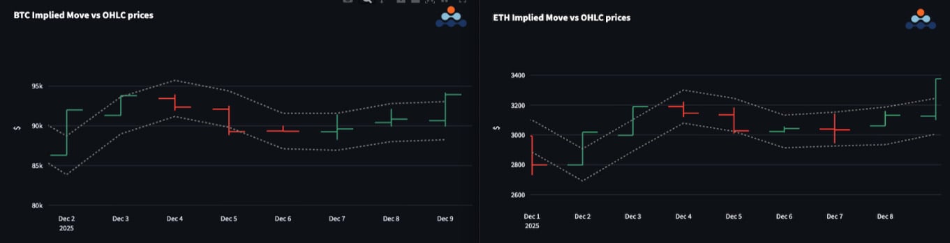 Front-end implied vol firmed ahead of the FOMC but otherwise continues to drift lower. Implied ranges held last week, with today’s ETH spike the first meaningful break above the upper bound.