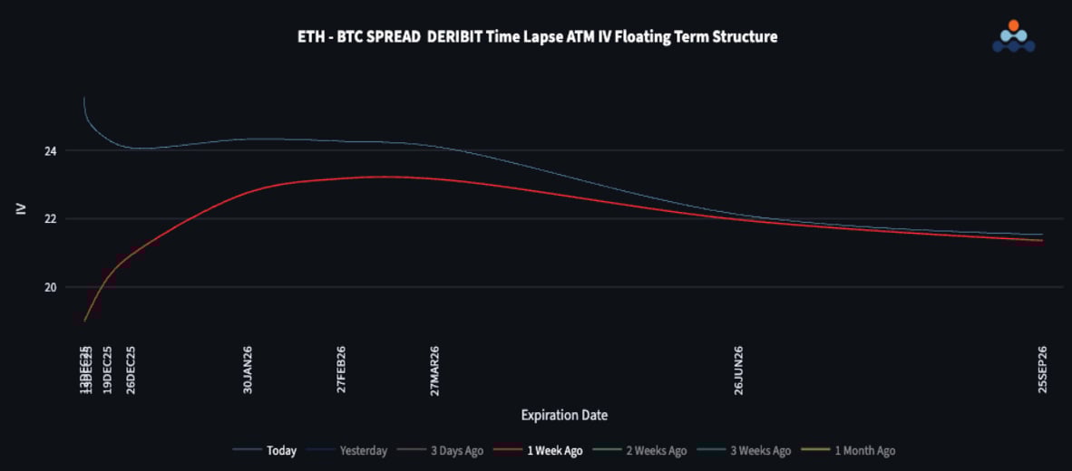 But the options market isn’t buying the breakout: front-end skew flipped bearish for ETH relative to BTC, showing demand for downside protection despite the rally. Longer-dated skew (2026+) still favours ETH upside, but near-term sentiment remains defensive.
