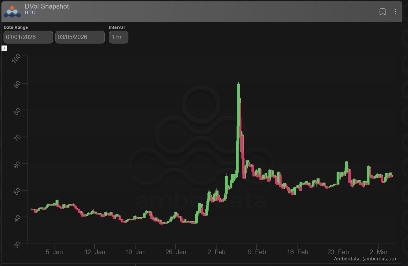 While Put Skew remains firm on the back of continued protection vs downside global uncertainties, decent clip buying of end-of-Mar and April 75k Calls take advantage of the depressed Call Skew and a contrary directional view.