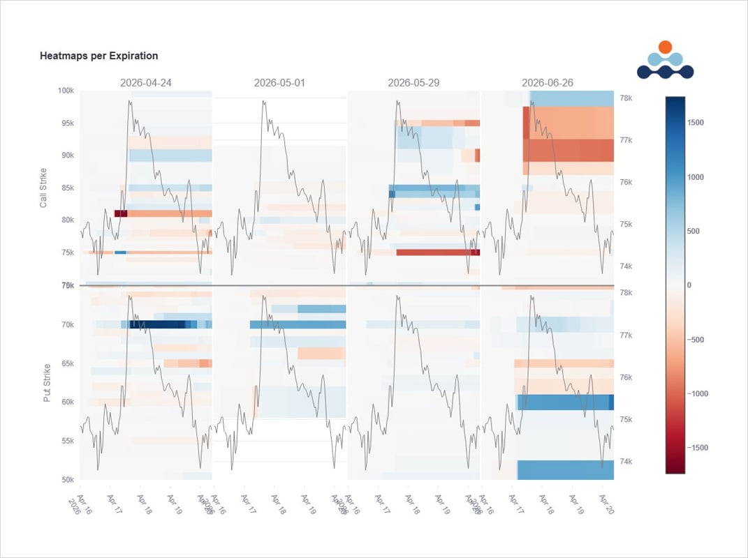 Signalling by Trump on an imminent Iran solution forced short Calls to cover and push up to higher strikes as BTC breached 78k. Not all were convinced as large exchanges took place in 70k Puts and further interest below. As the weekend rolled in, Iran pushed back, as did BTC.