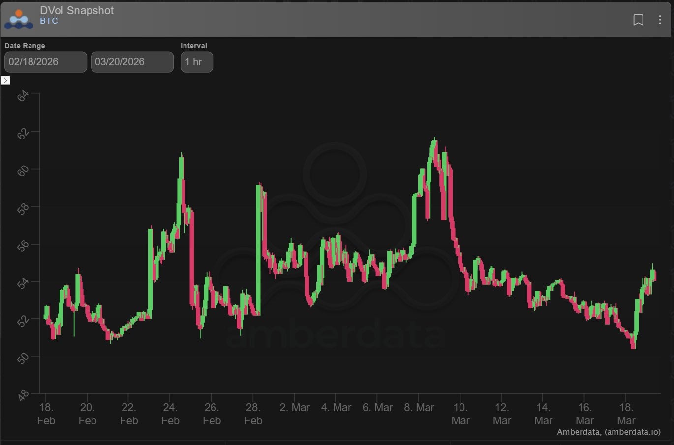 Dvol (1month proxy Implied Vol) is behaving in a very orderly manner, with even a little softening over the last couple days.